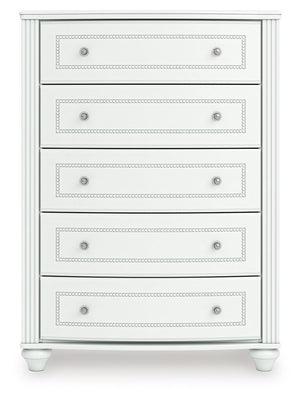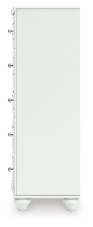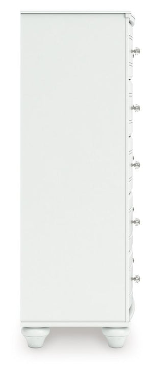 Fit for a princess. This chest of drawers’ crisp matte white finish pairs with charming elements like bun feet, crystal knobs and ornate beading—the perfect crowning touches for your girly girl. This spacious five-drawer piece is sure to make your little one feel like royalty.