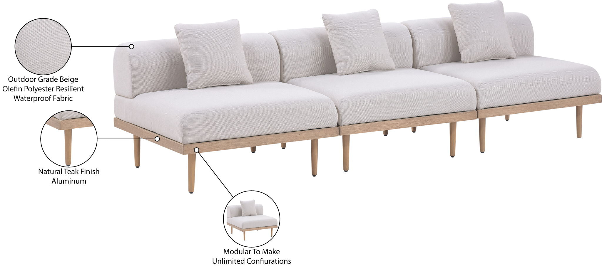 Sleek lines and soft water-resistant fabric bring contemporary style to the Laguna outdoor patio modular sofa. Crafted with a natural teak finish aluminum frame and quick-dry foam, it's built for ultimate outdoor relaxation. Rearrange or add to the set for endless configurations, creating a versatile lounging experience tailored to your space.