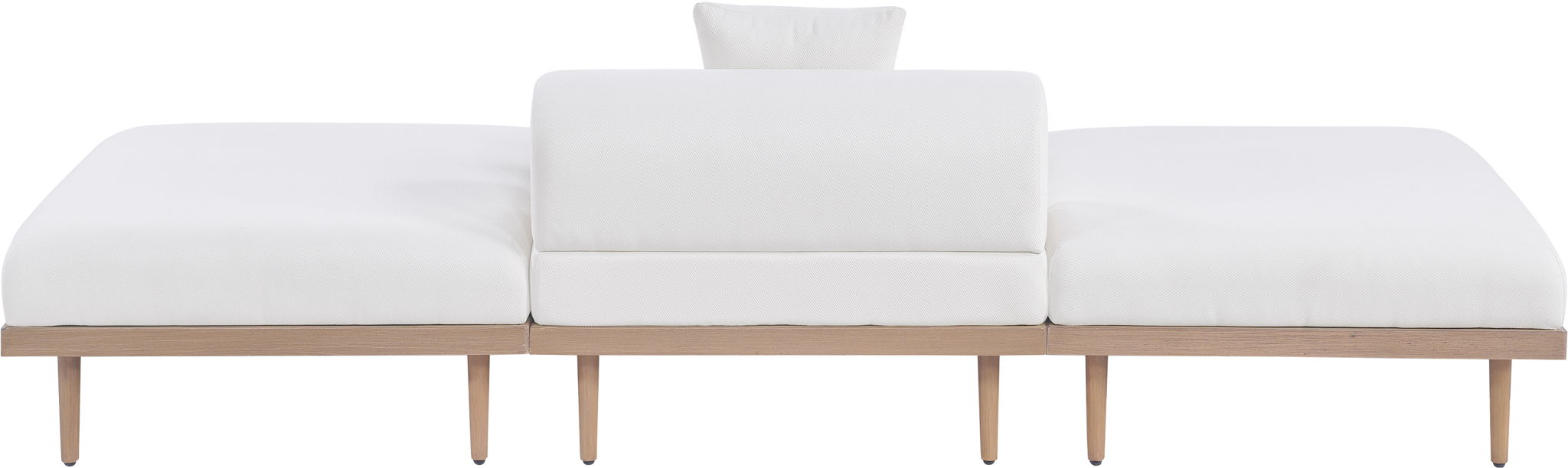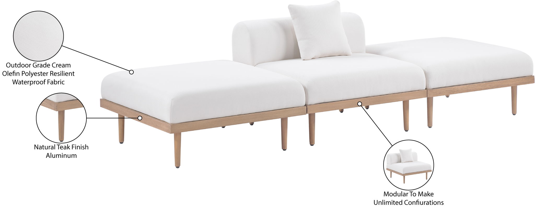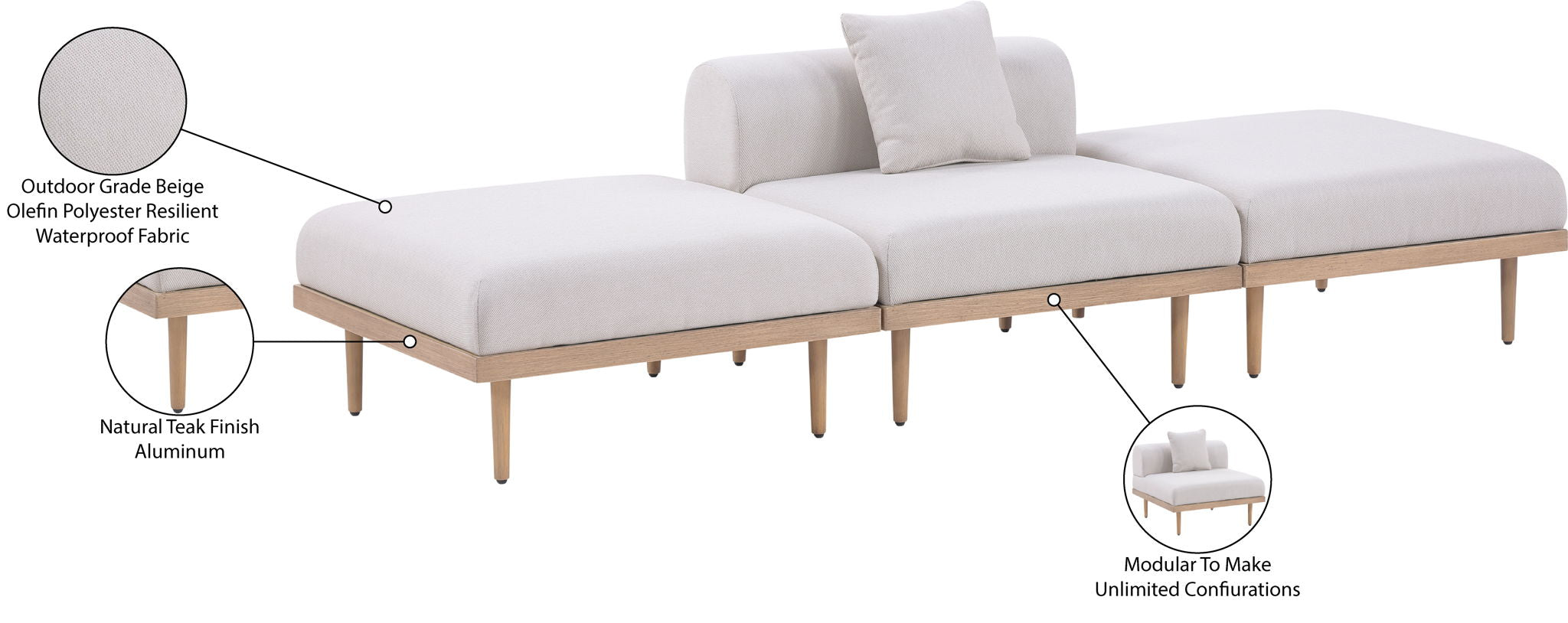 Sleek lines and soft water-resistant fabric bring contemporary style to the Laguna outdoor patio modular sofa. Crafted with a natural teak finish aluminum frame and quick-dry foam, it's built for ultimate outdoor relaxation. Rearrange or add to the set for endless configurations, creating a versatile lounging experience tailored to your space.