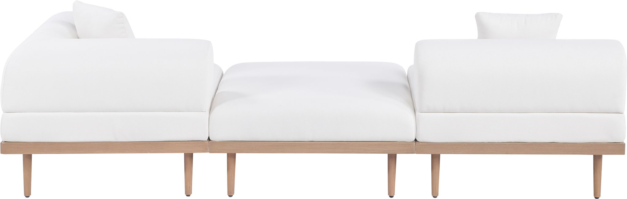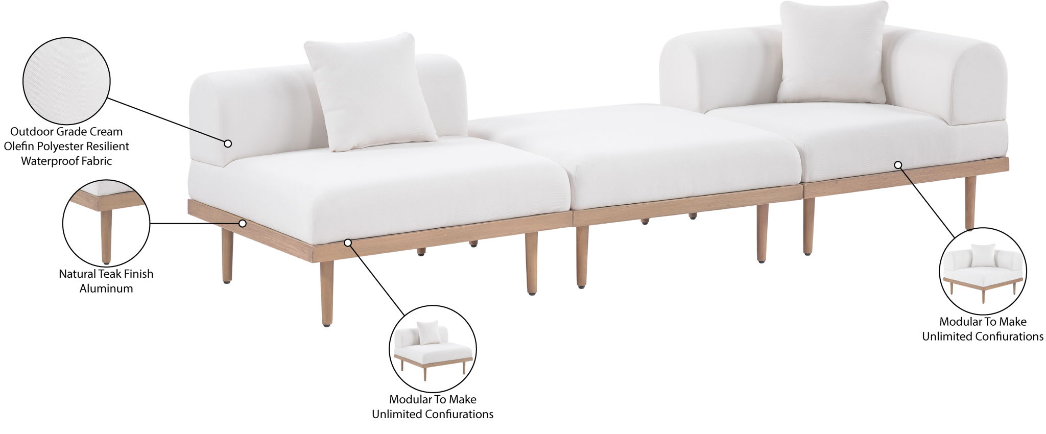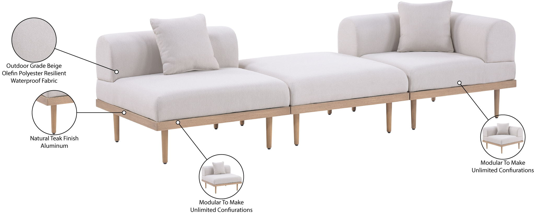 Sleek lines and soft water-resistant fabric bring contemporary style to the Laguna outdoor patio modular sofa. Crafted with a natural teak finish aluminum frame and quick-dry foam, it's built for ultimate outdoor relaxation. Rearrange or add to the set for endless configurations, creating a versatile lounging experience tailored to your space.