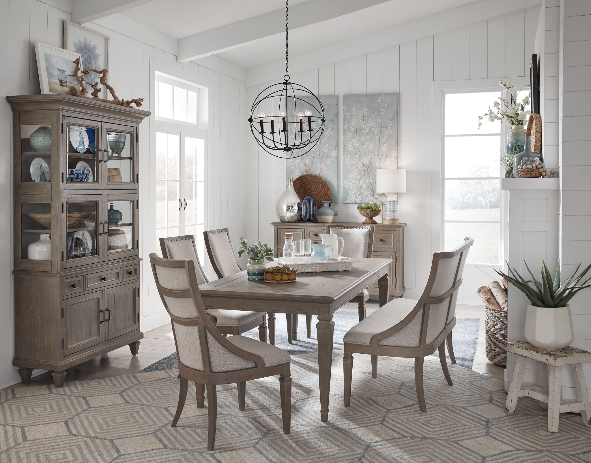 Inspired by inns and wineries in the Napa Valley, the Lancaster dining collection exudes the ambience of a laid-back resort. Crafted of high-low Pine and Hardwood Solids, the soft Dovetail Gray finish and Weathered Bronze hardware mix effortlessly with graceful turned legs and designer details to create a look that is distinctive yet inviting. Adding a casual classic and coastal flair, shutter wood doors are used on the server, and two shutter doors are also on the base of the counter table, with adjustable shelves behind. The distinctive piece selection includes a buffet, server and a dining cabinet with two wood-framed glass doors on the top and two on the bottom, offering 3-way touch lighting control with 2 LED lights. The table options include a 52-inch round and a 68-inch rectangular leg table. The tables can be extended to 70 inches and 86 inches, respectively, with use of a leaf. The rectangular counter table extends to 58W x 36H when the butterfly leaf is used. The versatile seating options include a side chair with upholstered seat and wood slat back, an upholstered seat and back chair, a bench with upholstered seat and wood trim, an elegant shaped chair with wood trim and upholstered seat and back, and counter-height dining chair with upholstered seat and slat back. Take a vacation without leaving home with the resort flavor created by the Lancaster dining collection.