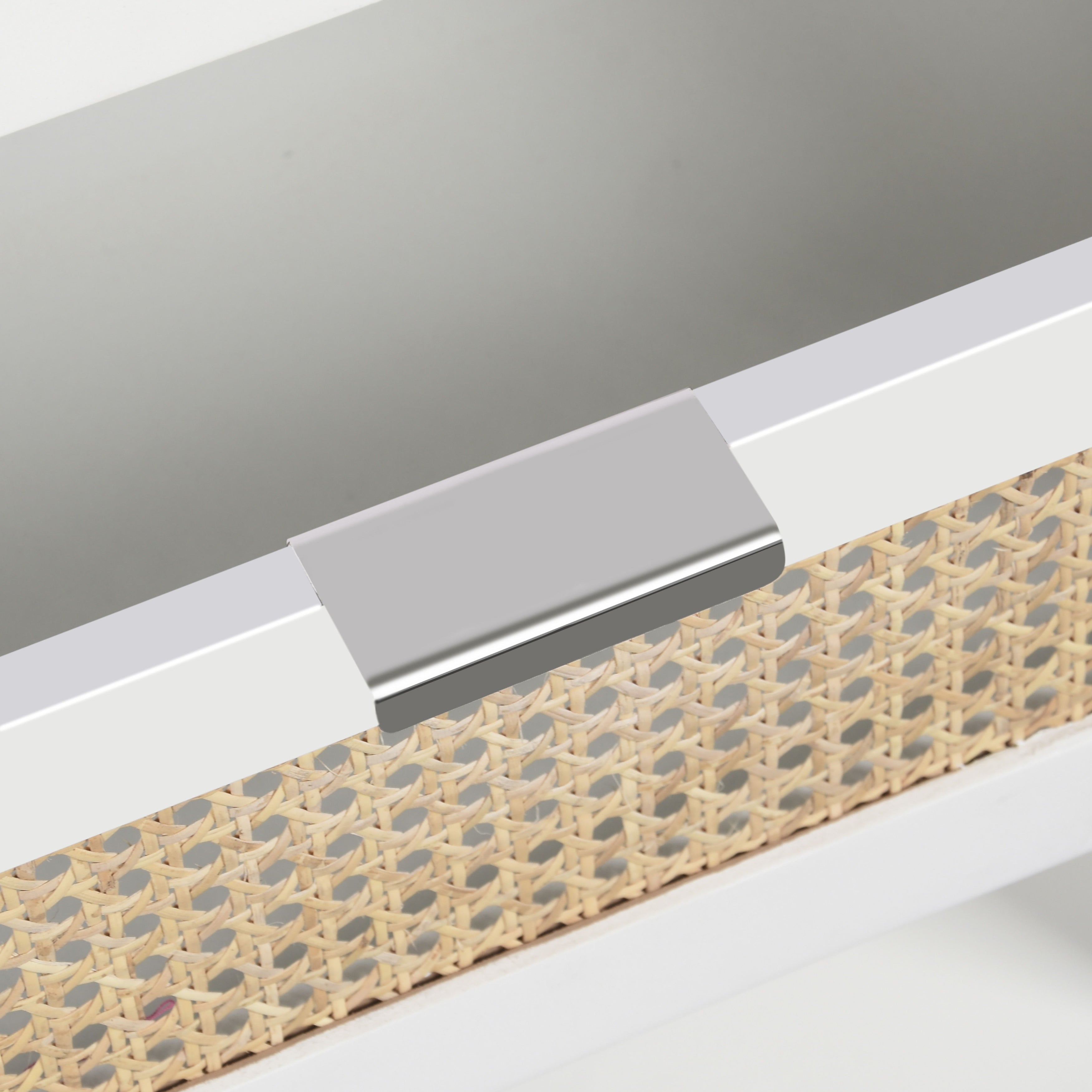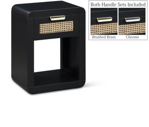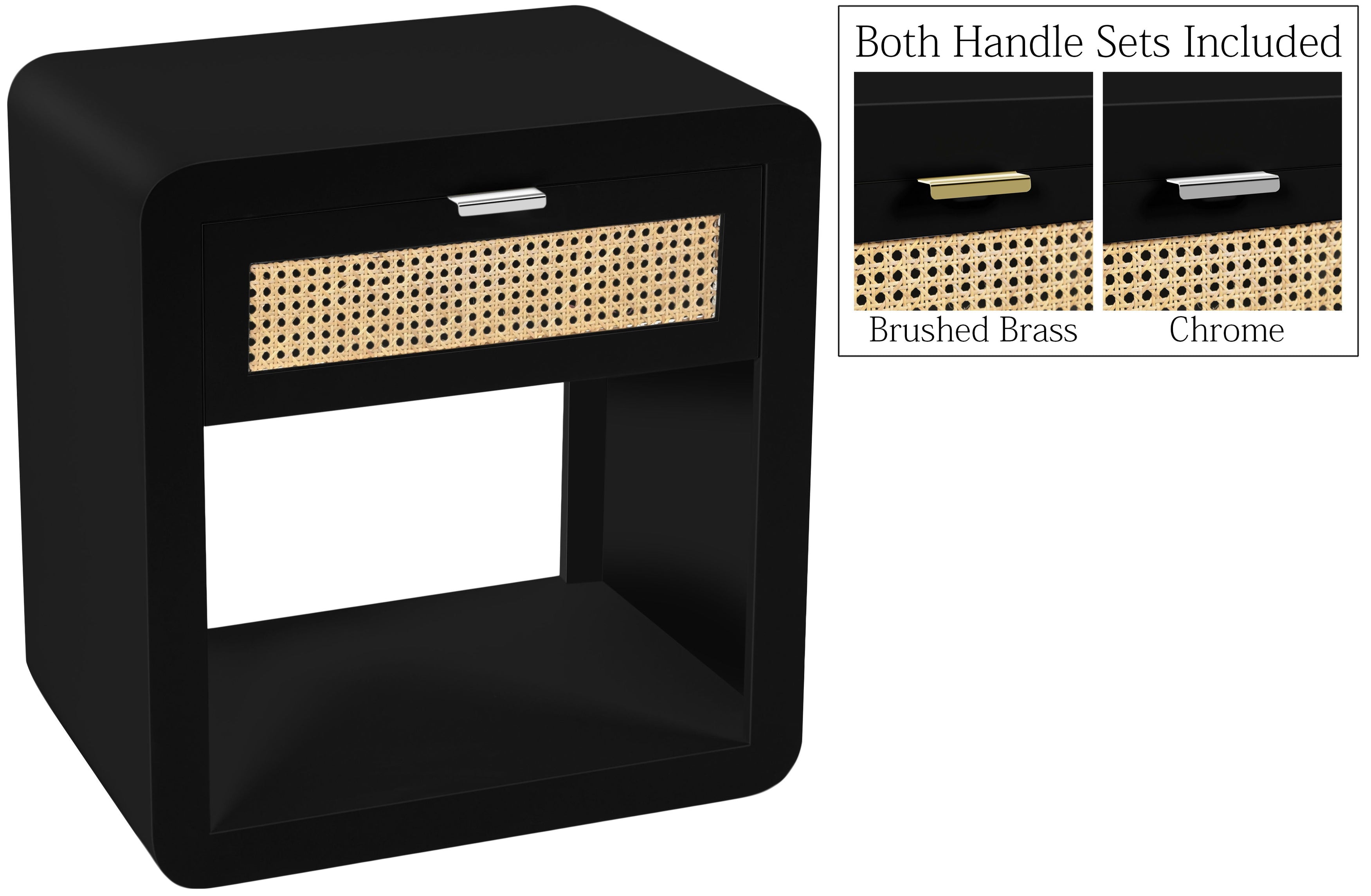 Lend your bedroom a distinctive touch with this Langham night stand from Meridian Furniture. Featuring an open, rectangular design and a natural cane drawer front, this night stand is truly unique. A sleek finish complements the existing decor in your bedroom; both brushed brass and handles are included so you can choose which one best matches your decor. This night stand s mid century design is the perfect addition to your living space.