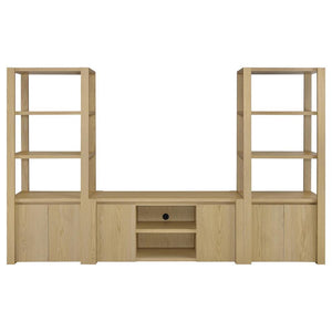 Graceful and grounded, this light oak entertainment center becomes the heart of your living space. A wide TV stand anchors the arrangement with open shelves and hidden storage, flanked by tall media towers that frame the scene with quiet elegance. Adjustable shelving and discreet cord cutouts offer flexibility without distraction. Crafted from engineered wood with a scratch-resistant and eco-friendly laminate veneer, it fits TVs up to sixty-five inches for a beautifully balanced display.