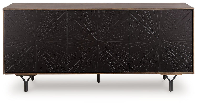 This accent cabinet combines classic function with elevated styling. Its ultra-sleek linear profile channels contemporary aesthetics, with the dark two-tone look lending a luxurious feel. Crafted with stunning mango wood, the carved sunburst pattern reflects superb attention to detail and refined craftsmanship. And for added function, push magnet doors gently open to reveal spacious storage.