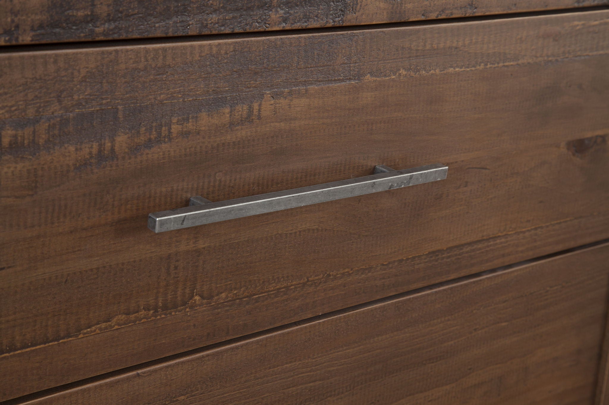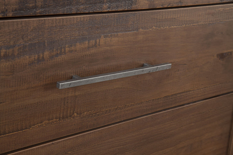 Clean lines combine with live edge distressing in a rustic modern Chest that offers vertical bedroom storage in a stunning package. The beveled post and sled base give this piece enough architectural interest to stand out in any room while five spacious drawers offer the storage needed for everyday items.