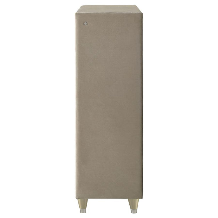 Embrace elegance in full velvet with this five-drawer chest, where ambient lighting meets refined craftsmanship. Upholstered in a harmonious mix of ivory and camel velvet, each drawer is adorned with quilted textures, reflective acrylic accents, and crystal knobs for a soft yet glamorous presence. Integrated LED lighting casts a warm glow, while the brown felt-lined top drawer, English dovetails, tempered glass top, and heavy-duty glides elevate everyday function. Supported by solid rubberwood legs, this chest blends softness with luminous charm.