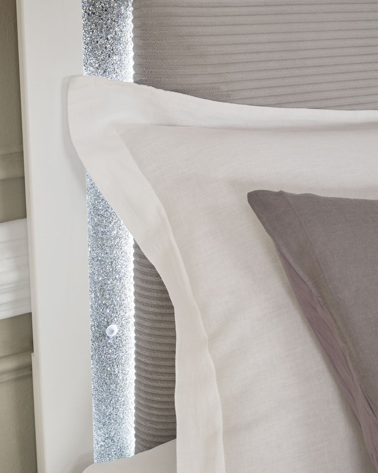For those with a penchant for modern glamour, this king upholstered panel bed reflects your upscale taste. It’s dressed in a crisp matte white finish, with an upholstered panel softening the look. Seamlessly incorporated LED accent lighting on the headboard provides practical and stylish illumination.