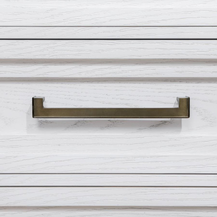 Add easy storage and inviting style to your bedroom with a modern five-drawer chest. It's tall, compact silhouette conserves space while adding welcome storage and organization. The chest features a distressed white finish to highlight wood grain details for a fresh, organic effect in your bedroom. Antique brass-toned bar pulls add contrast and definition on trimmed drawer fronts, creating inviting texture and depth. Tapered legs finish off this inviting look and a tip over restraint is included for added safety.
