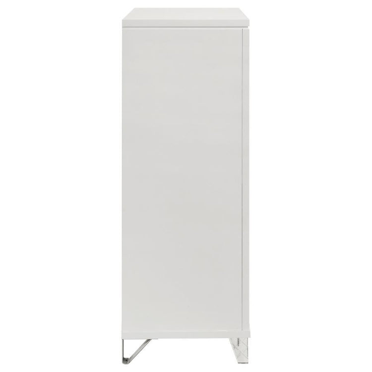 Maximize your bedroom storage with this stylish 5-drawer chest, featuring a modern Italian design. The white finish and picture framed recessed panels with embossed herringbone graphic patterns create a sophisticated look. Accented with mirror framing, acrylic legs, and polished chrome metal hardware, this chest offers ample storage space. Crafted from rubberwood, MDF, and mirror, this chest combines style and practicality, making it a perfect addition to your luxurious bedroom.