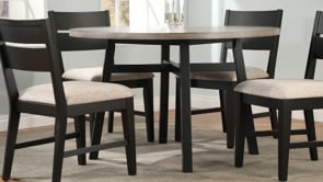 Create a warm and inviting dining space with this stylish and modern dining group, designed for both comfort and functionality. The round table features a beautifully crafted woodgrain top with a sawtooth detail, offering a timeless look that complements any décor. Supported by sturdy, tapered legs, it provides a sleek yet durable foundation for everyday meals and gatherings. The matching chairs showcase a contemporary ladder-back design with plush upholstered seats, ensuring optimal comfort for long conversations around the table. Perfectly balancing elegance and practicality, this set brings a fresh, sophisticated touch to any dining area.