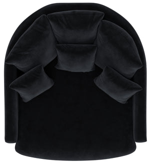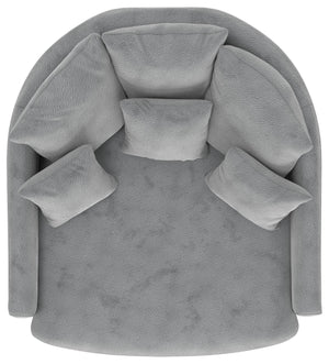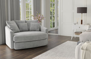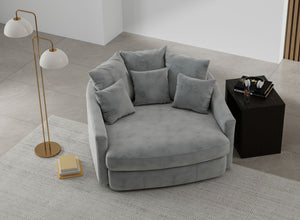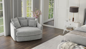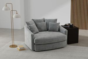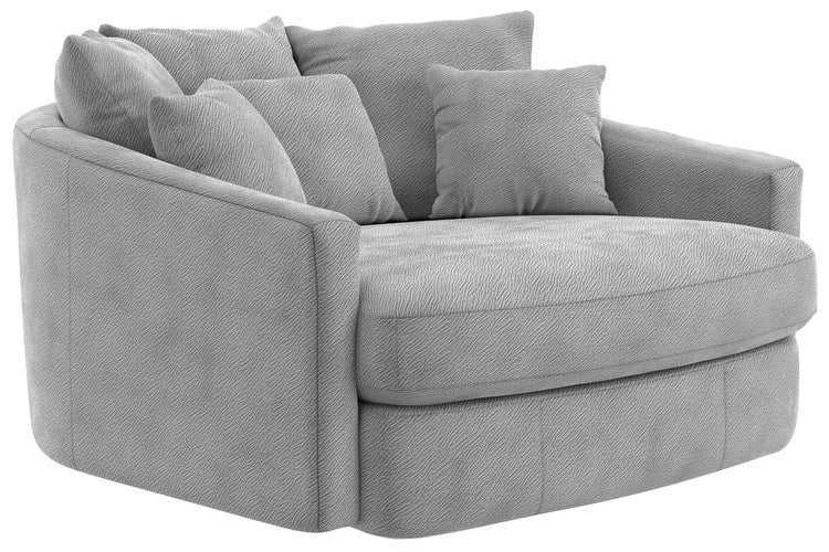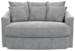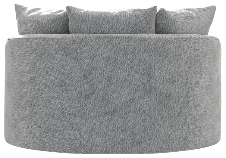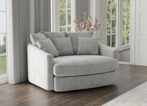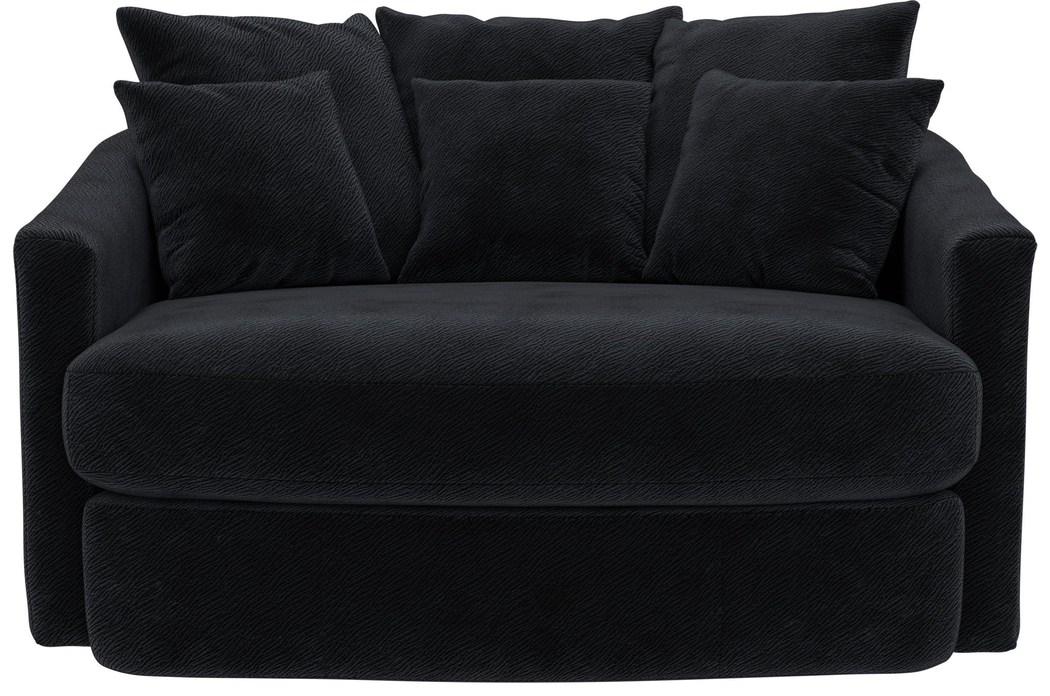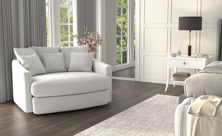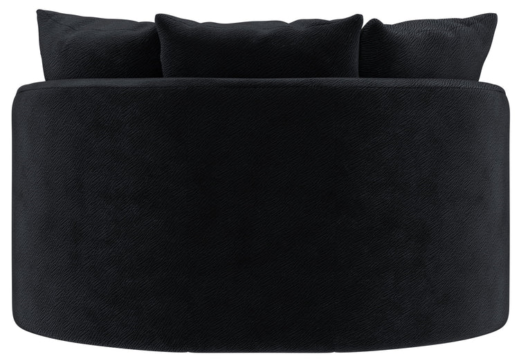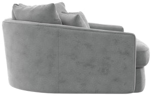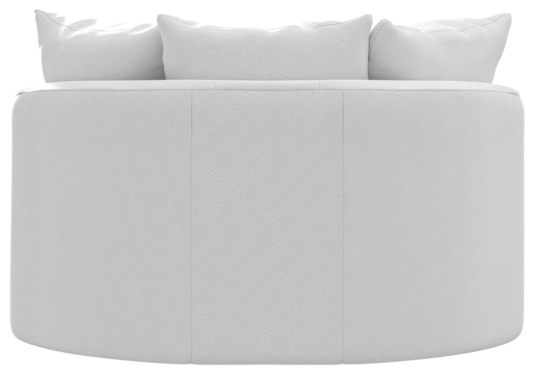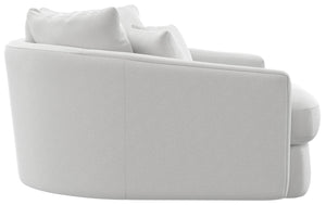 Matty is a large scaled Round Accent Cuddle Chaise and provides three back pillows and three accent pillows to form your perfect seat. Easily comfortable for two, this eclectic piece is available in your choice of three colors: Ebony, White or Pewter.