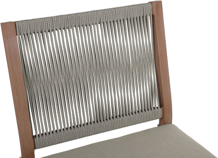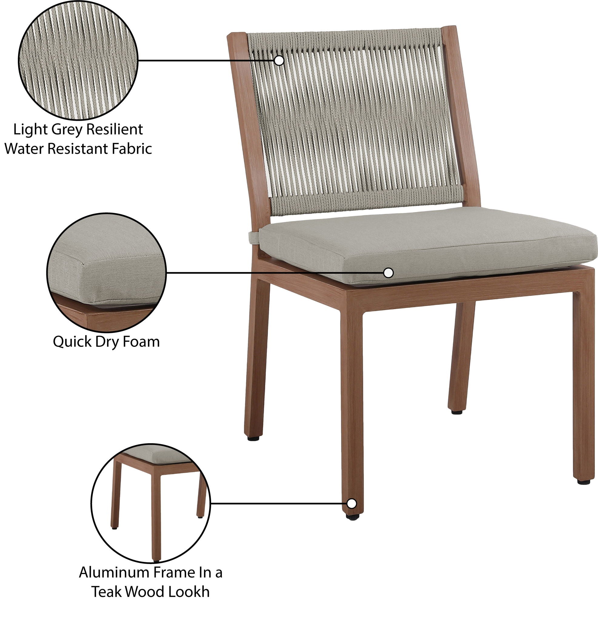 Make your outdoor oasis even more inviting with this Maui Outdoor Patio Dining Side Chair. Crafted with an aluminum frame to look like teak without the maintenance requirements, this dining side chair offers both style and convenience. Its resilient fabric cushions are water-resistant and plump and have quick-dry foam inserts. With its contemporary resort look, this chair adds sophistication to any patio, porch, or deck setting. Embrace the essence of outdoor comfort and style with this elegant addition - your perfect companion for leisurely moments outdoors.