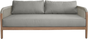 Make your outdoor oasis even more inviting with this Maui Water Resistant Fabric Outdoor Patio Loveseat. Crafted with an aluminum frame to look like teak without the maintenance requirements, this loveseat offers both style and convenience. Resilient fabric cushions, water-resistant and plump, have quick-dry foam inserts so you enjoy leisure time without worry. With its contemporary resort look, this loveseat adds sophistication to any patio, porch, or deck setting. Embrace the essence of outdoor comfort and style with this elegant addition - your perfect companion for leisurely moments outdoors.