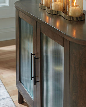 A masterclass in casual design, this accent cabinet’s capsule shape strikes a superbly fluid pose. Behind wood-framed doors with fluted glass inserts and black metal door pulls, you’ll find a fixed shelf for simple and streamlined storage. Functional and fabulous, it's a welcome addition to your living area or entryway.