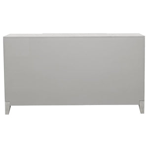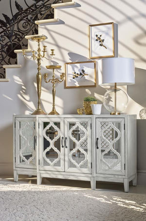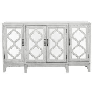 Elevate your space with this elegant accent cabinet featuring mirrored door panels and intricate lattice overlay. The soft white finish and vintage bronze hardware lend a timeless charm, while the spacious interior shelving keeps your essentials neatly stored. Perfect as a media cabinet or sideboard, this piece brings refined sophistication to living and dining areas alike.