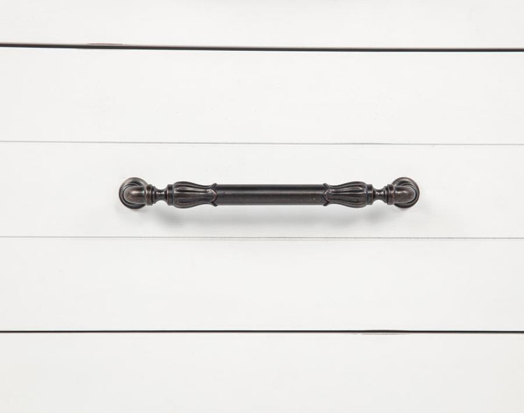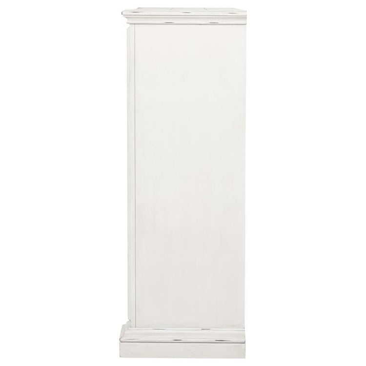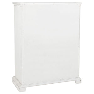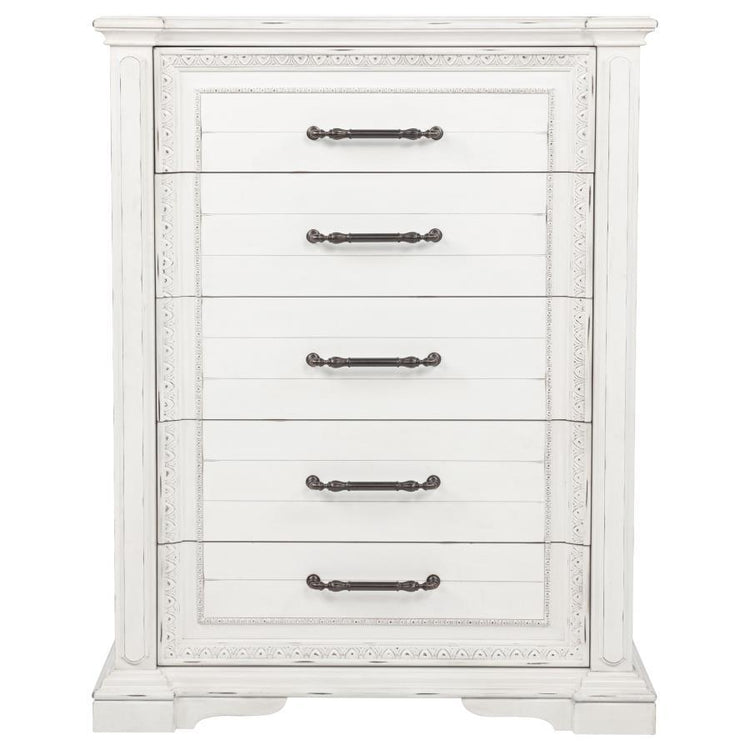 Timeless in spirit and refined in detail, this five-drawer chest evokes quiet charm and lasting beauty. A vintage white finish softens its stately frame, while molded edges and antique bronze ring pulls add character and depth. Designed with thoughtful craftsmanship, it offers spacious storage and smooth functionality. Built from poplar, engineered wood, and veneer, it brings elegance and purpose to the bedroom.