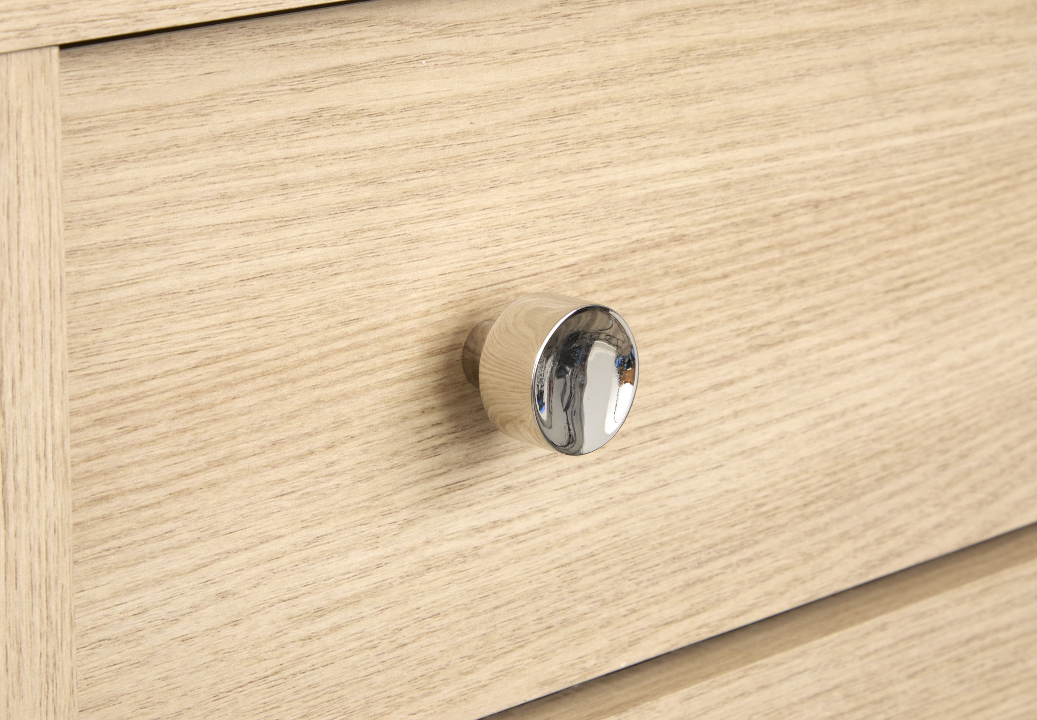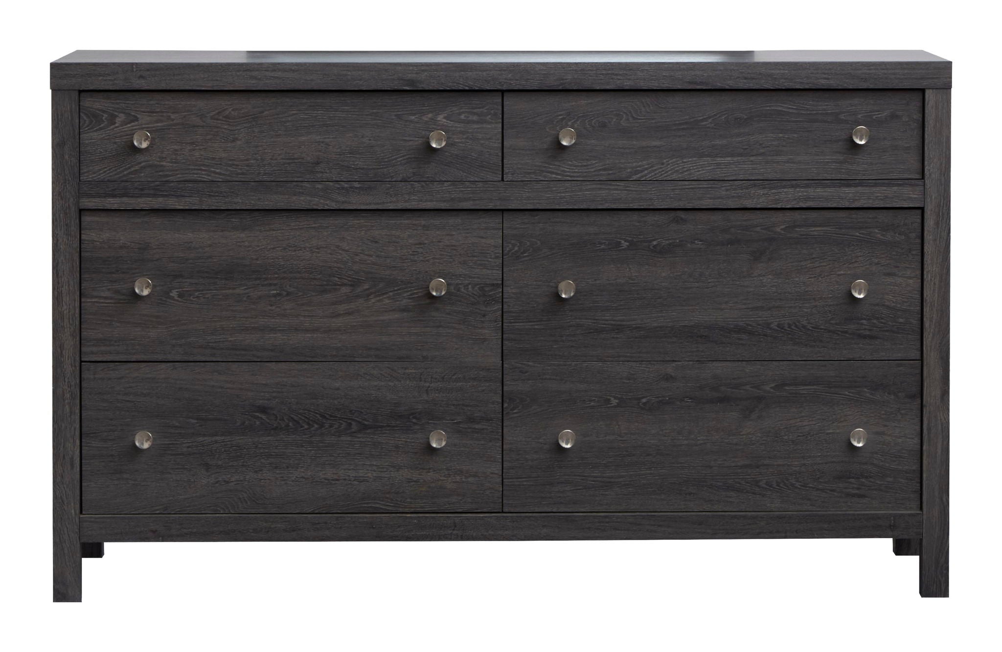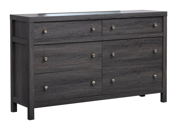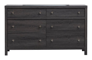 The Merrifield Collection boasts a bold Raisin Black finish and with rich undertones that mimic the texture of oak veneer and paired with sleek polished silver hardware to elevate its modern appeal. The casegoods feature minimalist lines and a sophisticated multi-dimensional finish and creating a clean and contemporary look that blends effortlessly into any modern bedroom. Perfect for contemporary interiors and the Merrifield Collection's combination of premium oak laminate and hardwood solids and and polished silver accents will transform your bedroom into a stylish and modern retreat.