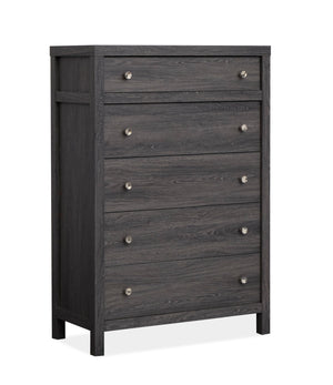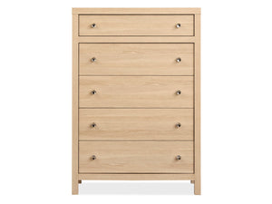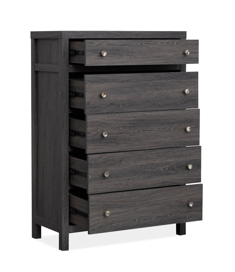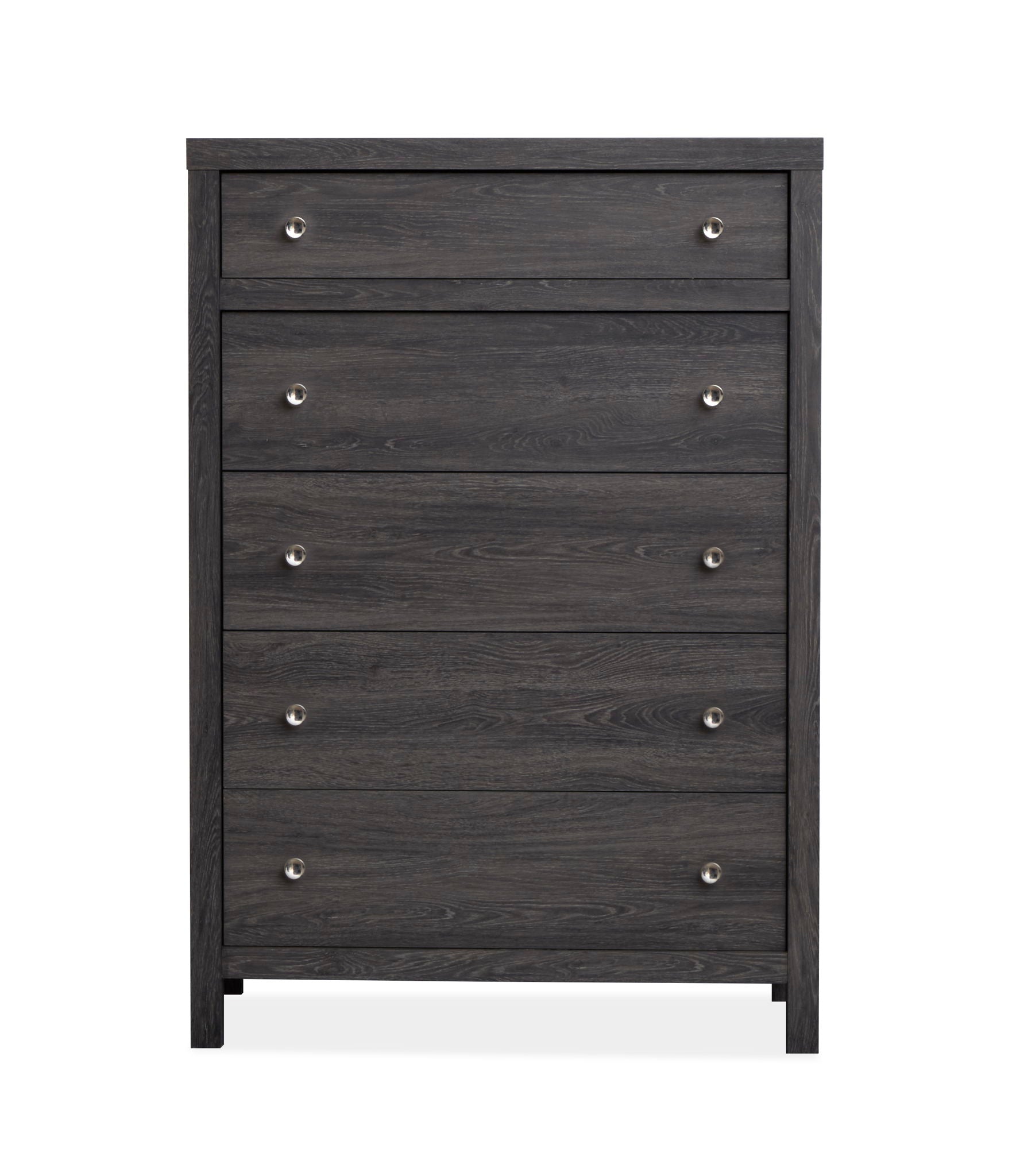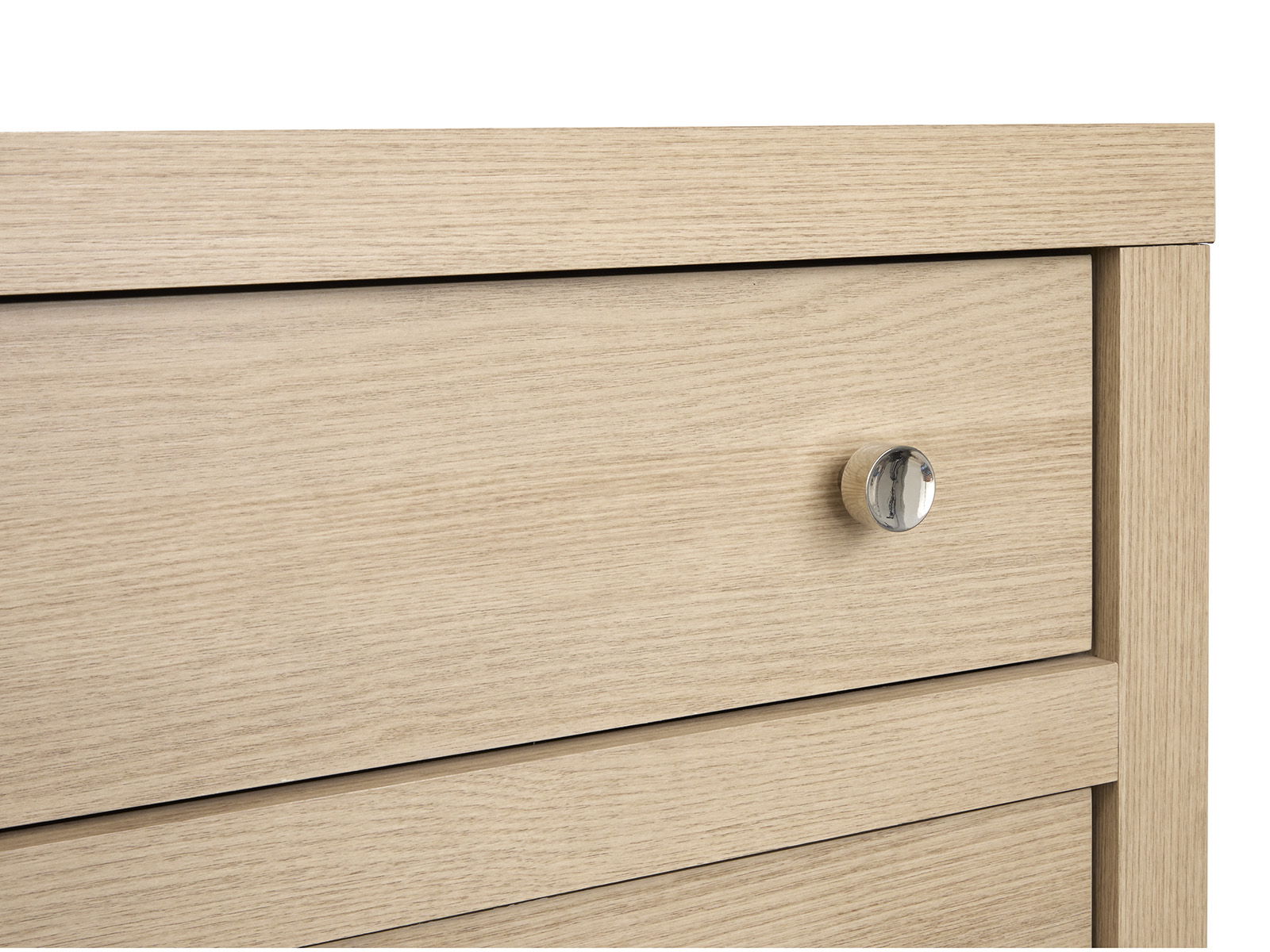The Merrifield Collection boasts a bold finish and with rich undertones that mimic the texture of oak veneer and paired with sleek polished silver hardware to elevate its modern appeal. The casegoods feature minimalist lines and a sophisticated multi-dimensional finish and creating a clean and contemporary look that blends effortlessly into any modern bedroom. Perfect for contemporary interiors and the Merrifield Collection's combination of premium oak laminate and hardwood solids and and polished silver accents will transform your bedroom into a stylish and modern retreat.