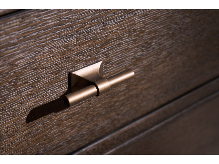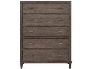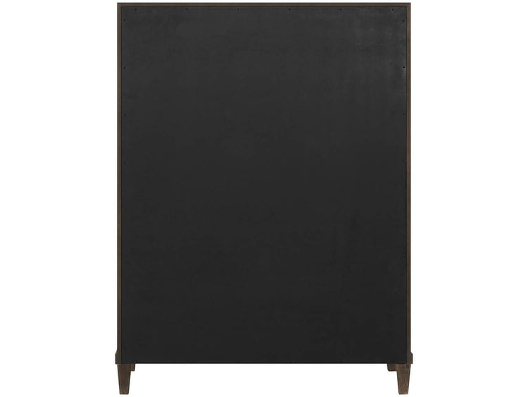 The Cocoa Chest offers versatile storage in a tall, slender profile that maximizes floor space efficiently. Finished entirely in signature Cocoa oak with subtle sandblasted texture, this five-drawer piece provides practical bedroom storage while maintaining refined aesthetic appeal.