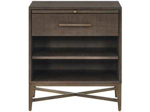 The Montclair Nightstand features elevated design with one Embossed Cocoa drawer and a convenient pull-out shelf, all supported by an elegant Smoked Gold X-frame base. This piece exemplifies sophisticated material blending with practical bedside function.