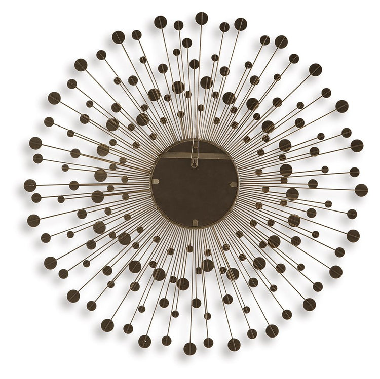 Light and bright, this accent mirror is a trendy take on wall decor. Its metallic spokes splay outward to create a sculpture-like frame. With goldtone and bronze-tone finishes, the piece is a reflection of your eye for contemporary design.