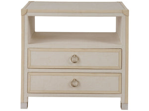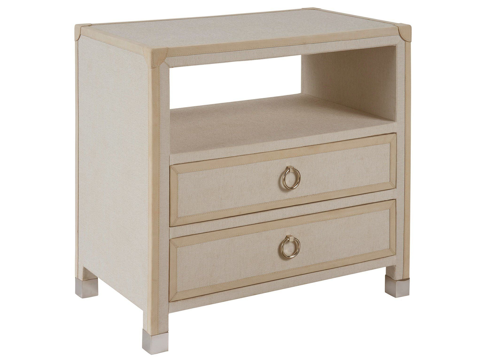 The Riven Nightstand showcases an imaginative blend of modern textures, featuring two drawers adorned with polished nickel ring pulls. Its body is elegantly wrapped in fabric, complemented by light gray leather edging, creating a sophisticated contrast. An open-air shelf adds functionality, providing a space for display or storage, and enhancing the nightstand's contemporary appeal.