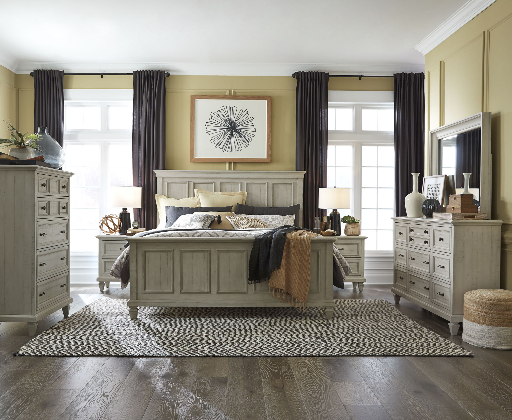 Inspired by the architecture and landscape of California Wine Country and the Newport bedroom collection exudes the ambience of laid-back luxury. Crafted of high-low Pine and Pine Solids and the soft Alabaster finish and Brushed Pewter hardware mix effortlessly with graceful turned legs and designer details to create a look that is bold yet inviting. Adding a casual and coastal resort flair and Shutter wood doors are used on select pieces. Crisp and updated and Newport promises long-lasting design and sturdy construction for any relaxed setting.