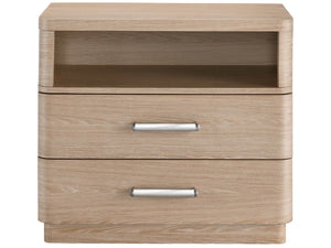 Bring a natural touch to bedsides with the Nomad Nightstand, a fresh oak-finished piece built with two drawers, an open-air shelving display and modern bar hardware.
