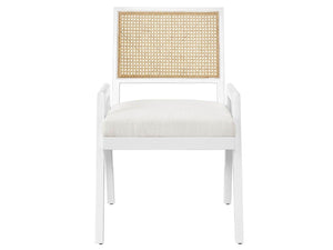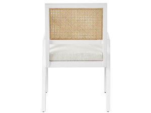 The Sonora Arm Chair brings subtle bohemian vibes to home interiors with its striking pairing of materials, including a woven cane back, a crisp white body and a plush upholstered seat cushion.