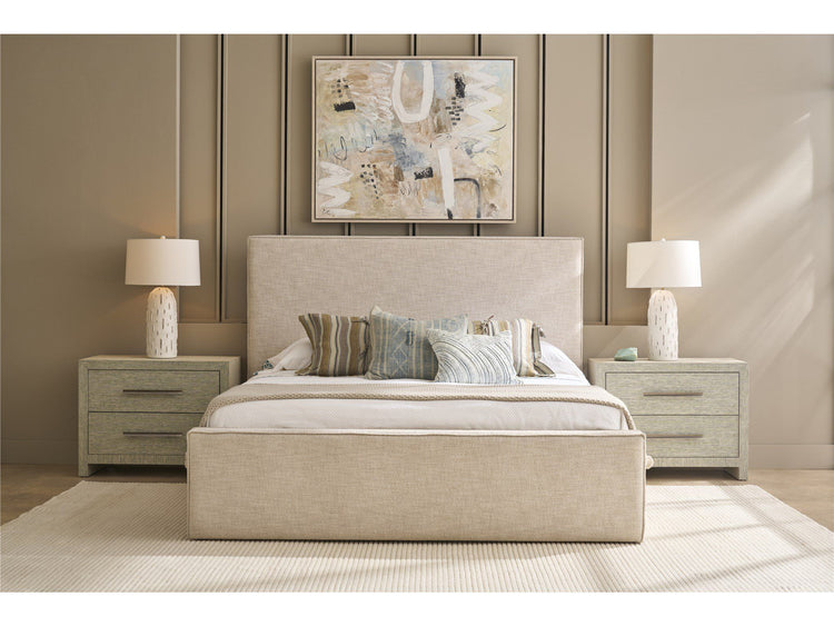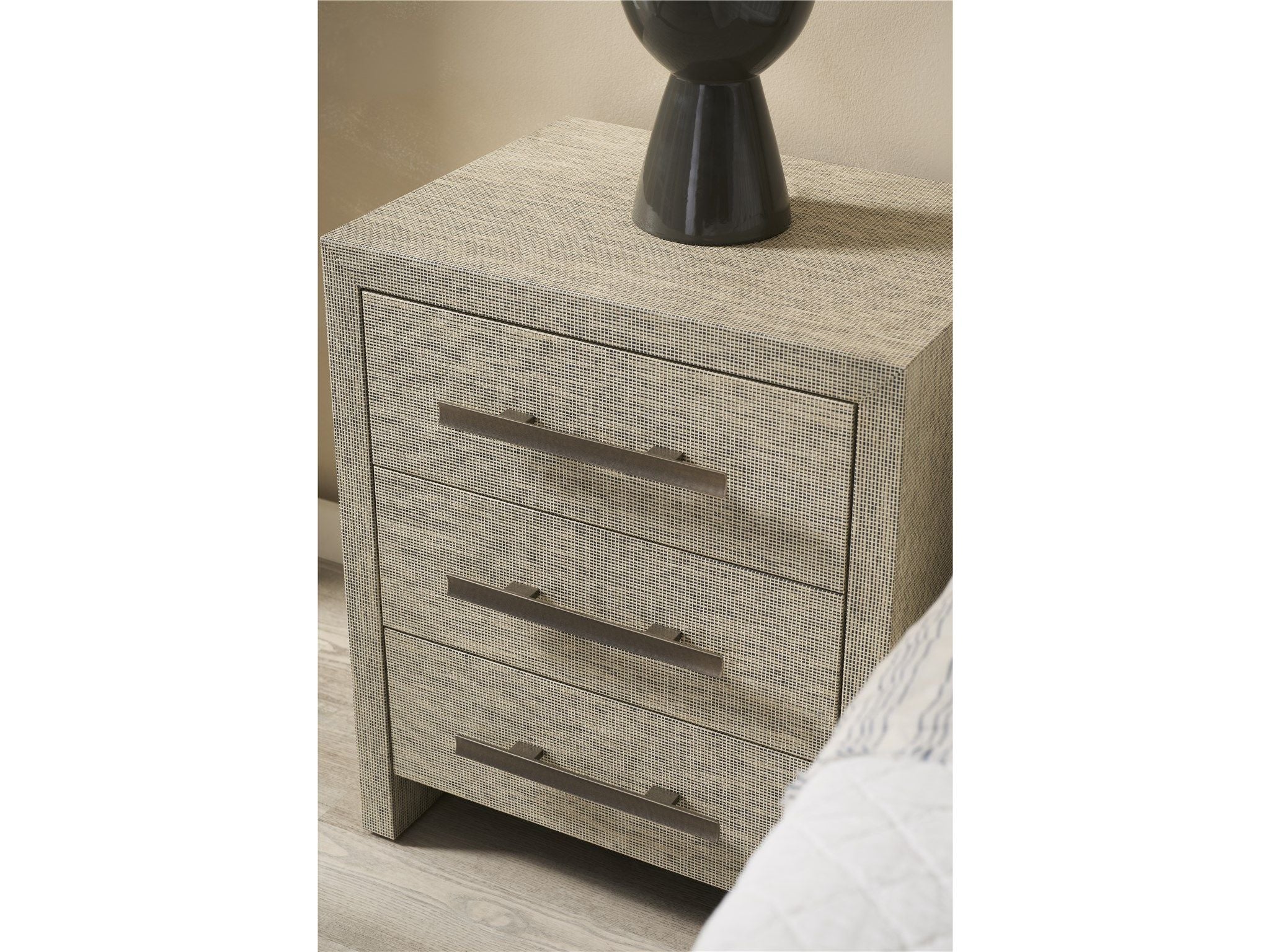 The Seascape Nightstand combines closed storage with an open shelf space, all wrapped in textured Seascape grasscloth wallpaper. This perfectly proportioned nightstand offers the perfect balance of surface area and storage while bringing rich texture to your coastal bedroom.