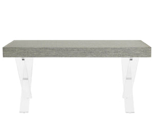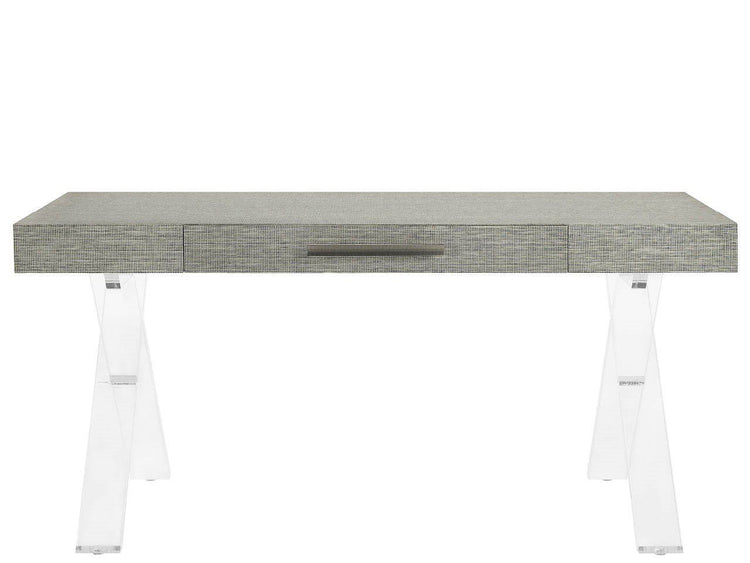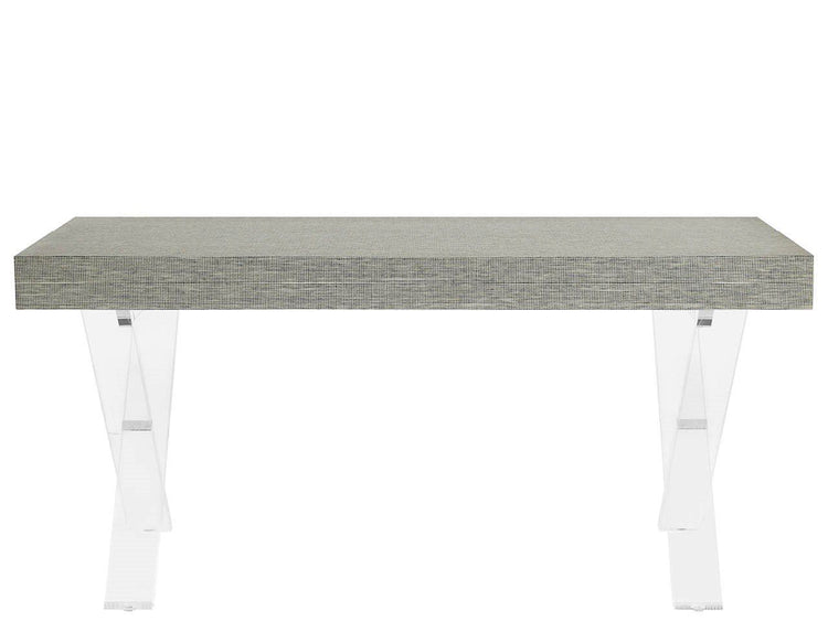 A whisper of coast and clarity: Seascape’s wallpaper-wrapped silhouette floats on crystalline acrylic legs, with a discreet pencil-tray drawer to keep the surface serene for ideas to flow.