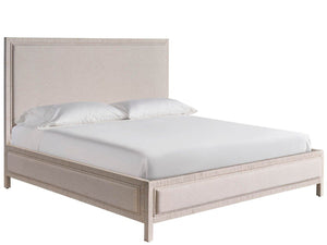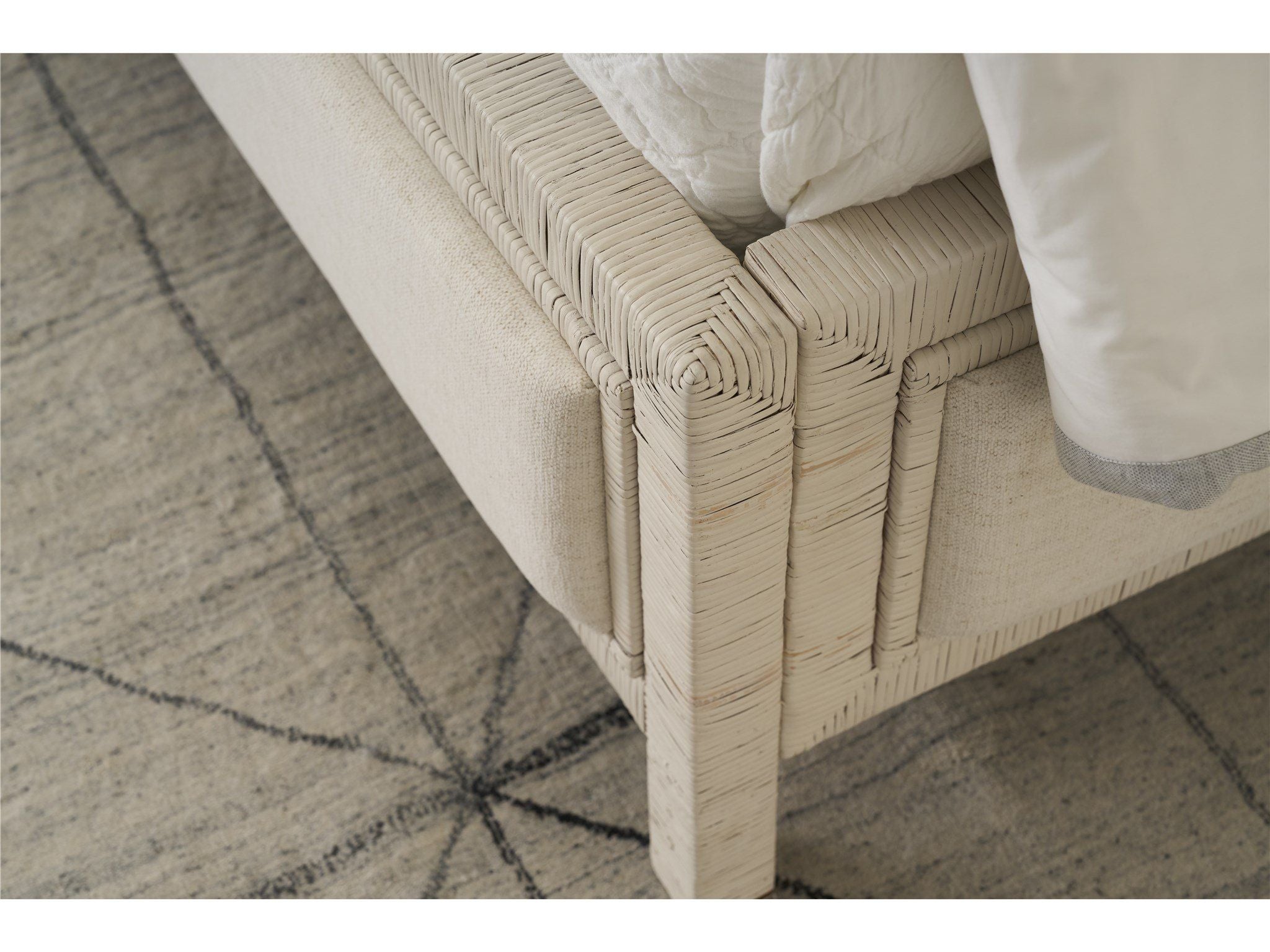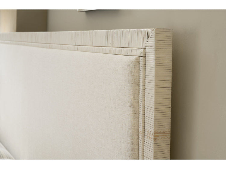 The Tidal Bed showcases clean-lined upholstered panels beautifully framed in white rattan, creating a perfect balance of comfort and coastal style.