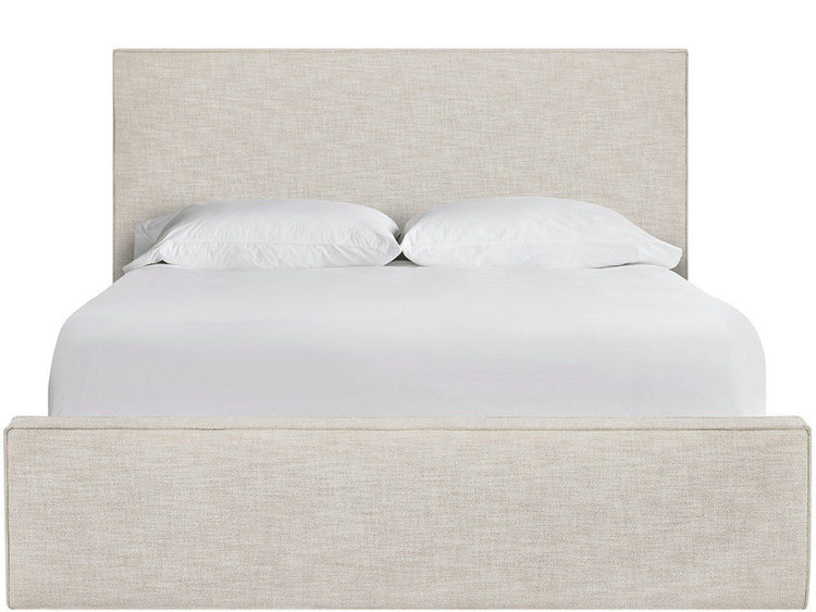 The Drift Upholstered Bed wraps you in comfort with its fully upholstered headboard and footboard in neutral Yukon Sand fabric with sophisticated double flange detail. This king-sized bed, measuring 83 inches wide by 58 inches tall, brings a tailored yet relaxed presence to your bedroom retreat.