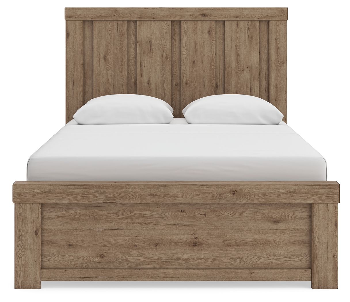 This panel bed delivers a fresh, trend-right spin on rustic design. Its wood tones, log-look accents and dimensional detailing create a look that’s effortlessly chic yet grounded in authenticity. Complete with log-look accents capping the headboard and footboard, this bed has a substantial style that feels timeless.