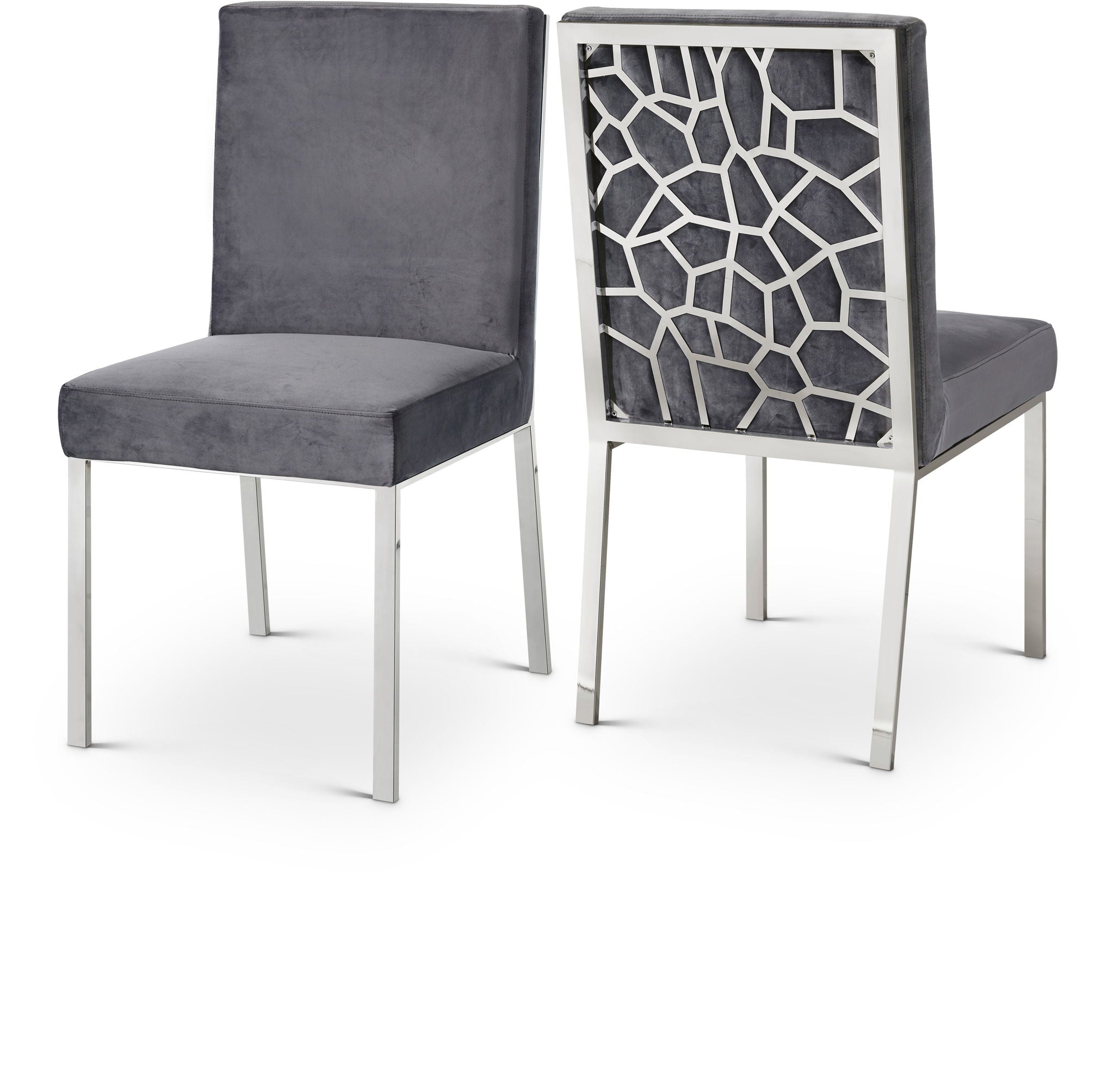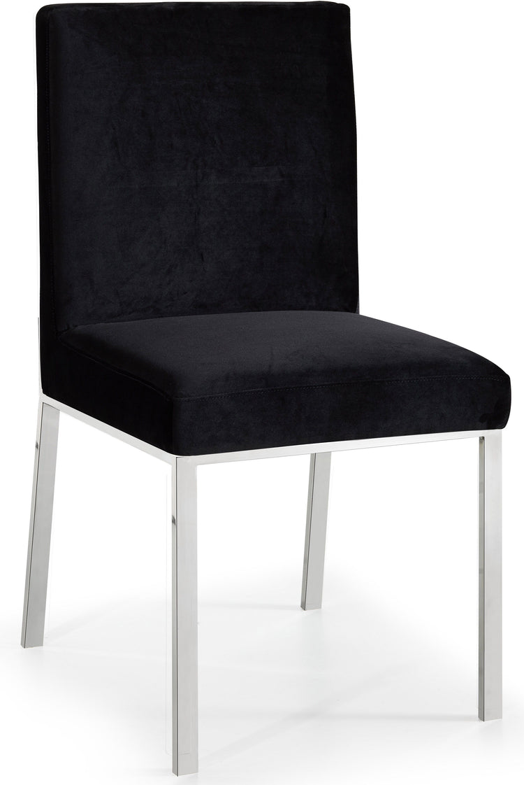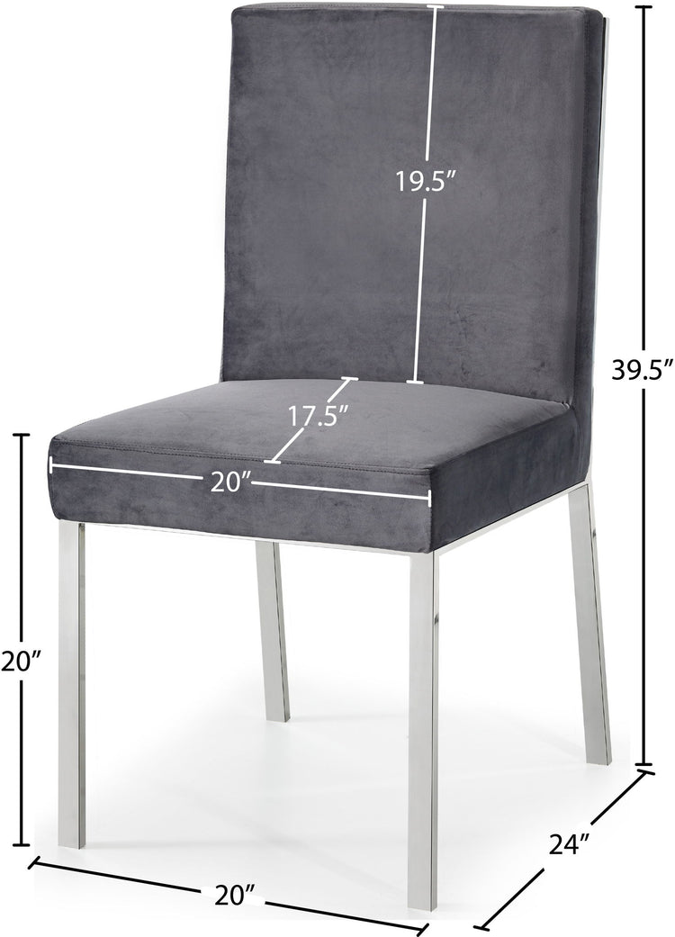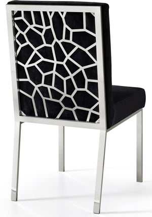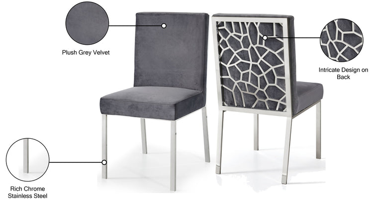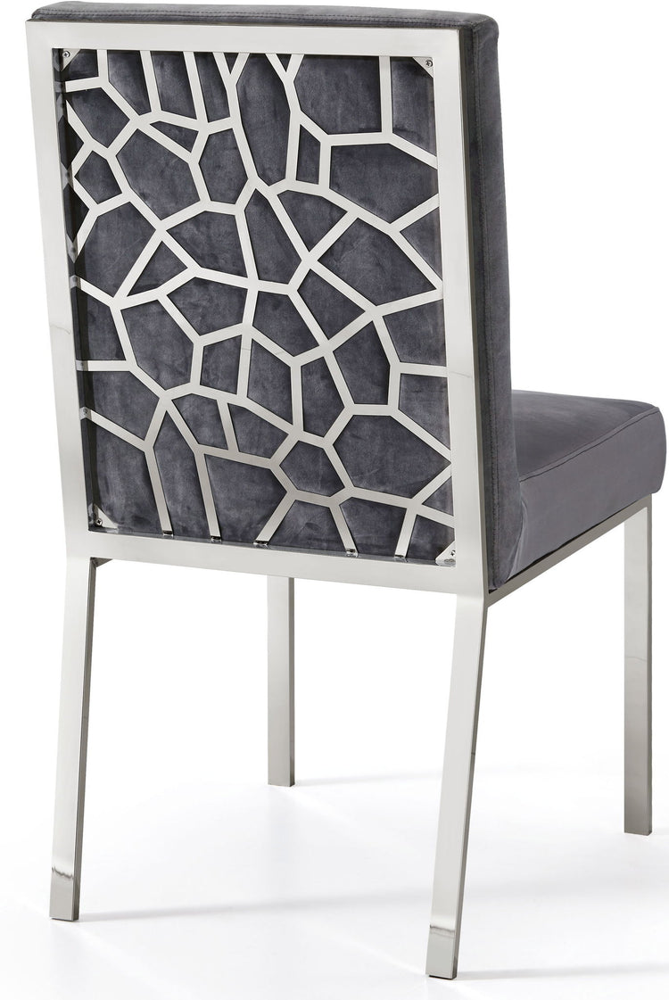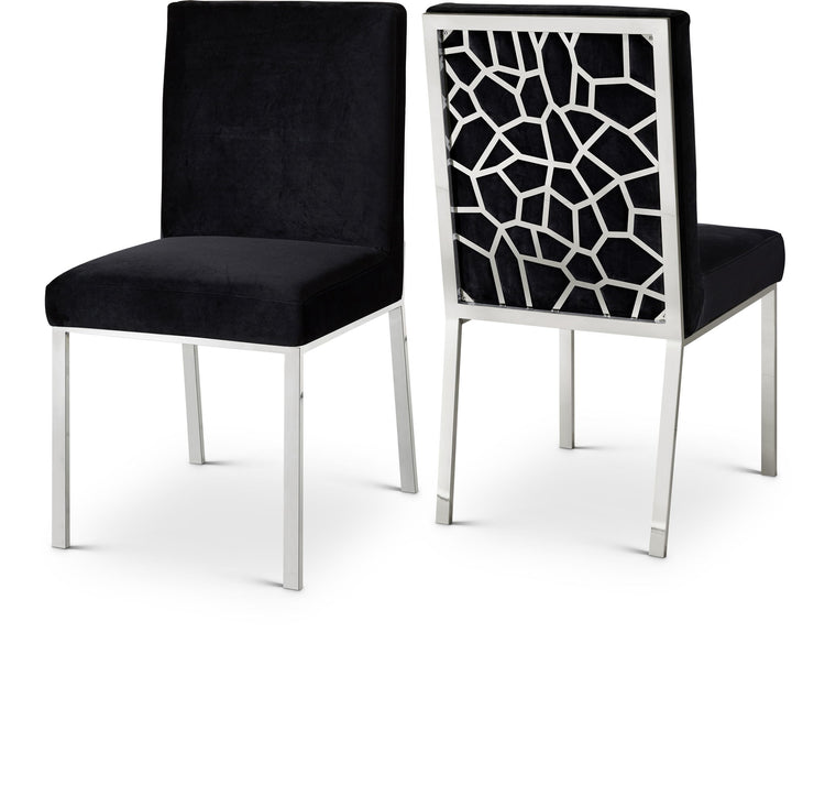Make dinnertime a stylish affair when guests are seated in this Opal Collection velvet dining chair from Meridian Furniture. The back of the chair features an intertwined sculptural design with a geometric motif for a modish effect that increases the wow factor in your dining space. Thick, plump seat and back cushions make sitting more comfortable, and each cushion is topped in crushed plush velvet for a luxurious touch and soft feel against the skin. The chair's base and back feature stainless steel construction with a finish for a contemporary vibe and sturdy support.