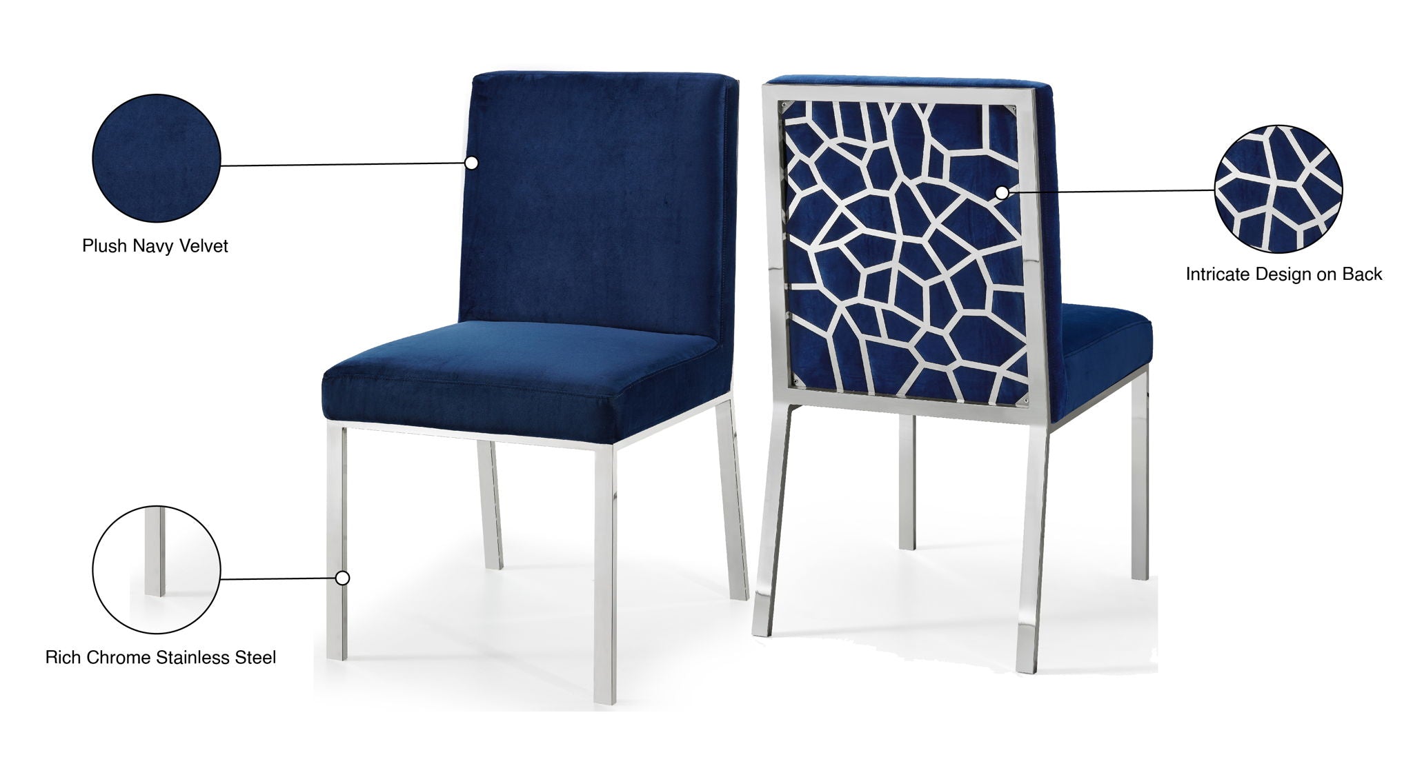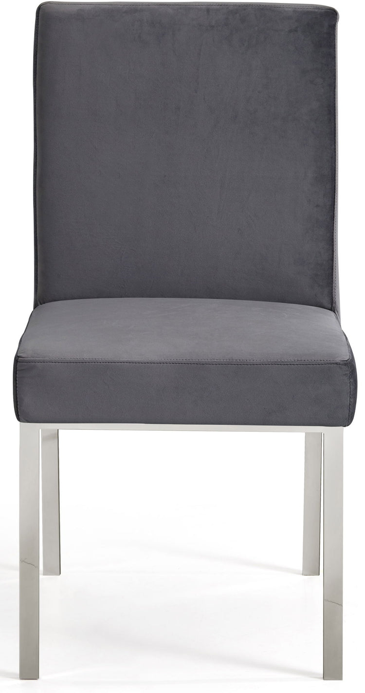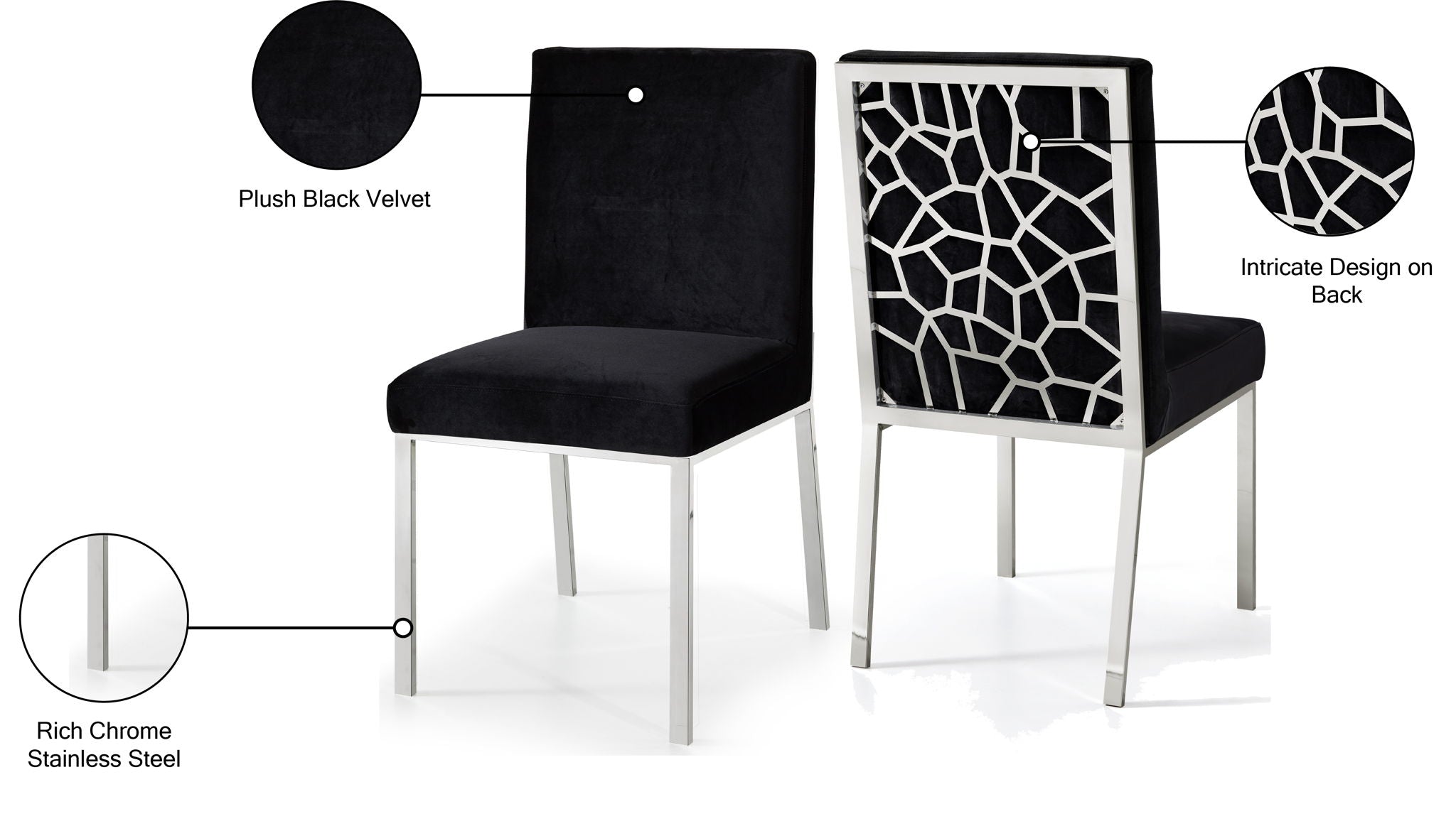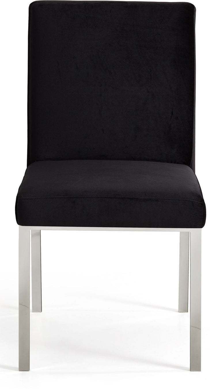 Make dinnertime a stylish affair when guests are seated in this Opal Collection velvet dining chair from Meridian Furniture. The back of the chair features an intertwined sculptural design with a geometric motif for a modish effect that increases the wow factor in your dining space. Thick, plump seat and back cushions make sitting more comfortable, and each cushion is topped in crushed plush velvet for a luxurious touch and soft feel against the skin. The chair's base and back feature stainless steel construction with a finish for a contemporary vibe and sturdy support.