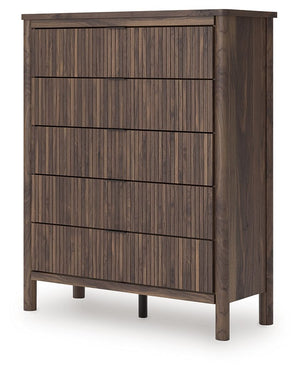 Crafted with both form and function in mind, this chest of drawers brings a dash of retro-cool character to your modern boho aesthetic. Reeded accents add an on-trend touch to its classic silhouette. Warmly welcoming with a rich brown finish, the piece pairs well with muted hues, earth tones and other neutrals alike. What a refined take on easygoing style.