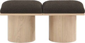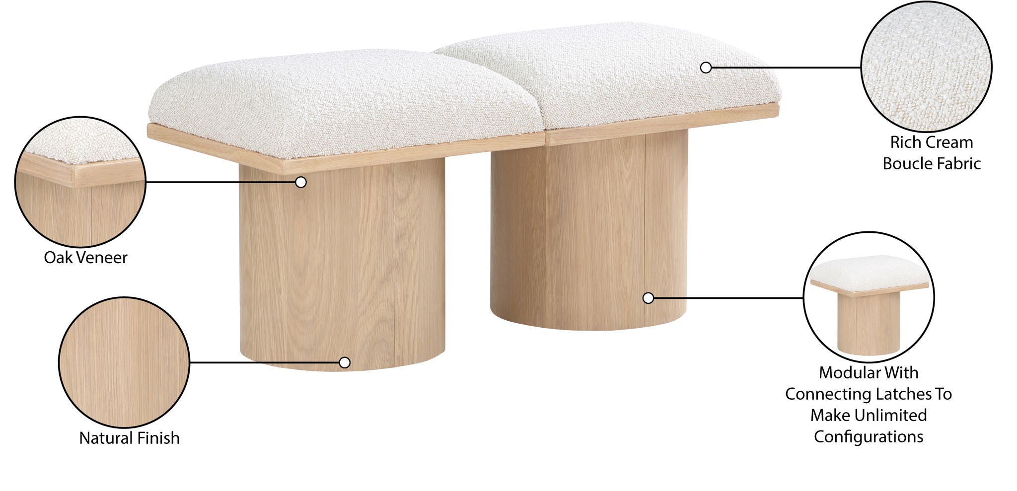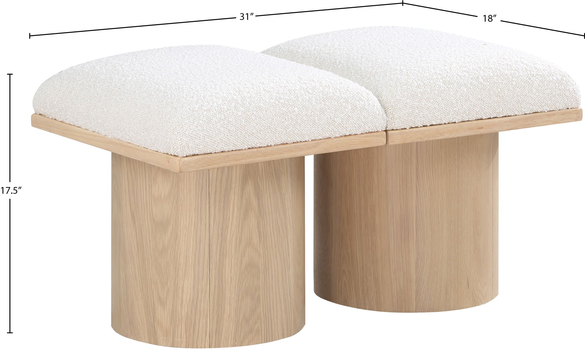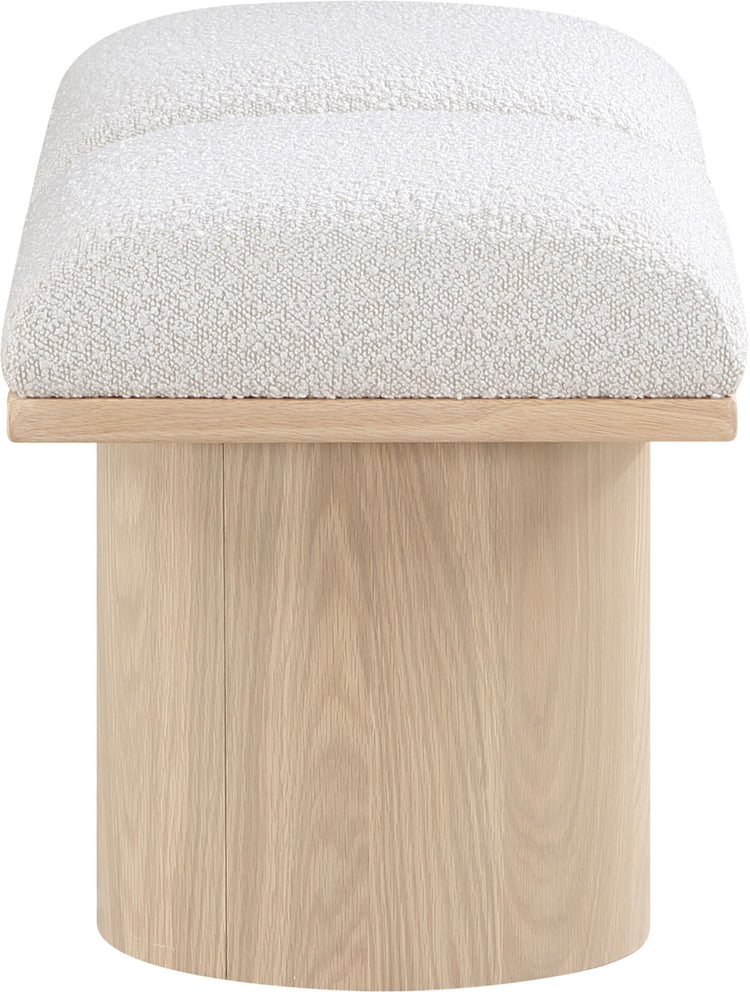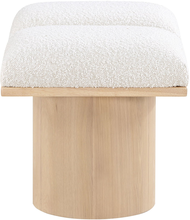 Bring valuable seating and remarkable style to your space with this Pavilion boucle fabric bench, an exquisite balance of style and usability for the entryway, bedroom, and beyond. Crafted from oak veneer with a natural finish, this bench has a 4-inch-thick seat cushion that's channel-tufted for a touch of luxury. The bench's columnar bases add a dash of art deco design, making it a captivating focal point in any room.
