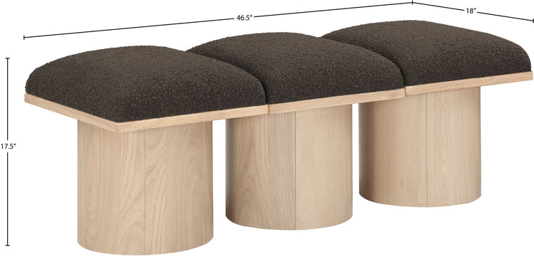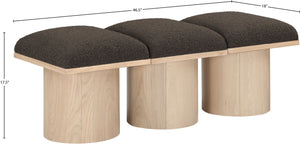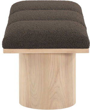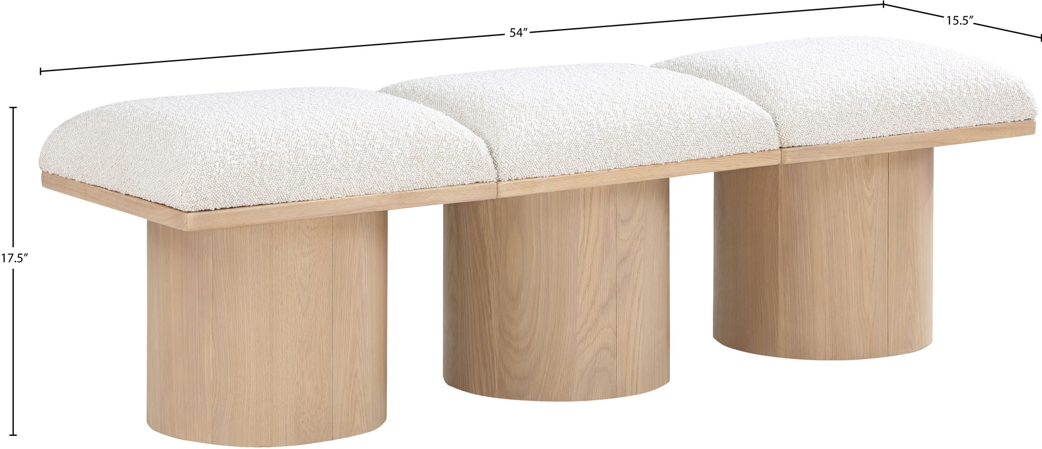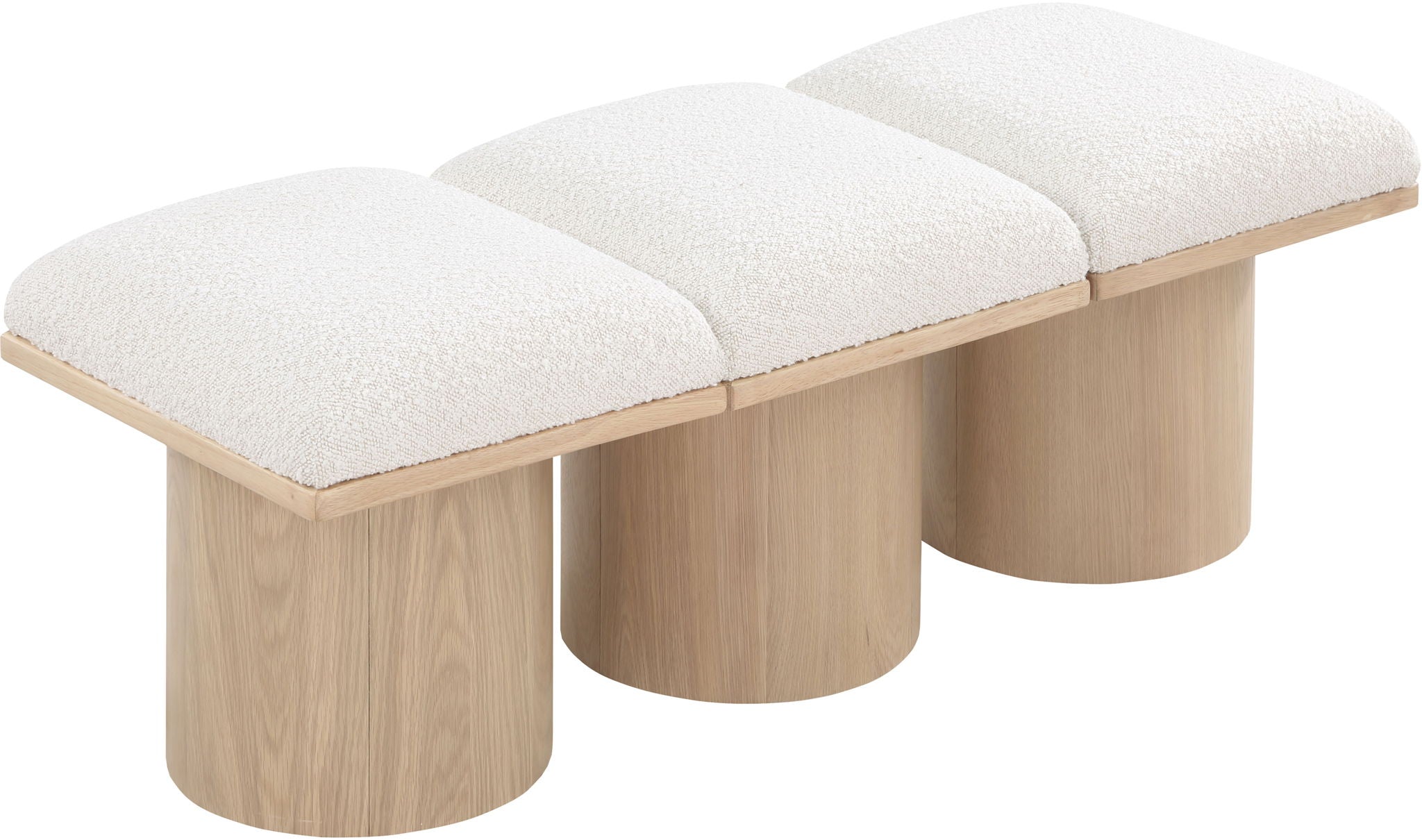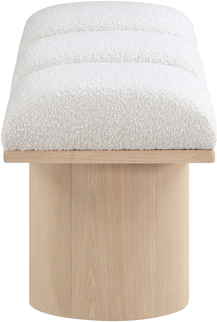 Bring valuable seating and remarkable style to your space with this Pavilion boucle fabric bench, an exquisite balance of style and usability for the entryway, bedroom, and beyond. Crafted from oak veneer with a natural finish, this bench has a 4-inch-thick seat cushion that's channel-tufted for a touch of luxury. The bench's columnar bases add a dash of art deco design, making it a captivating focal point in any room.