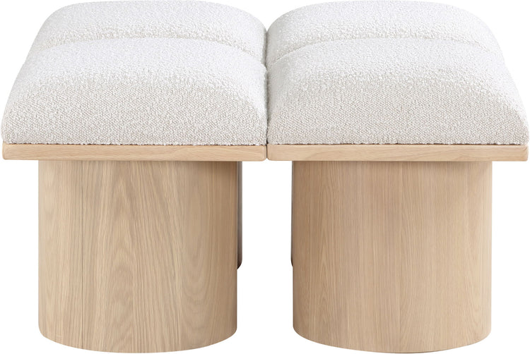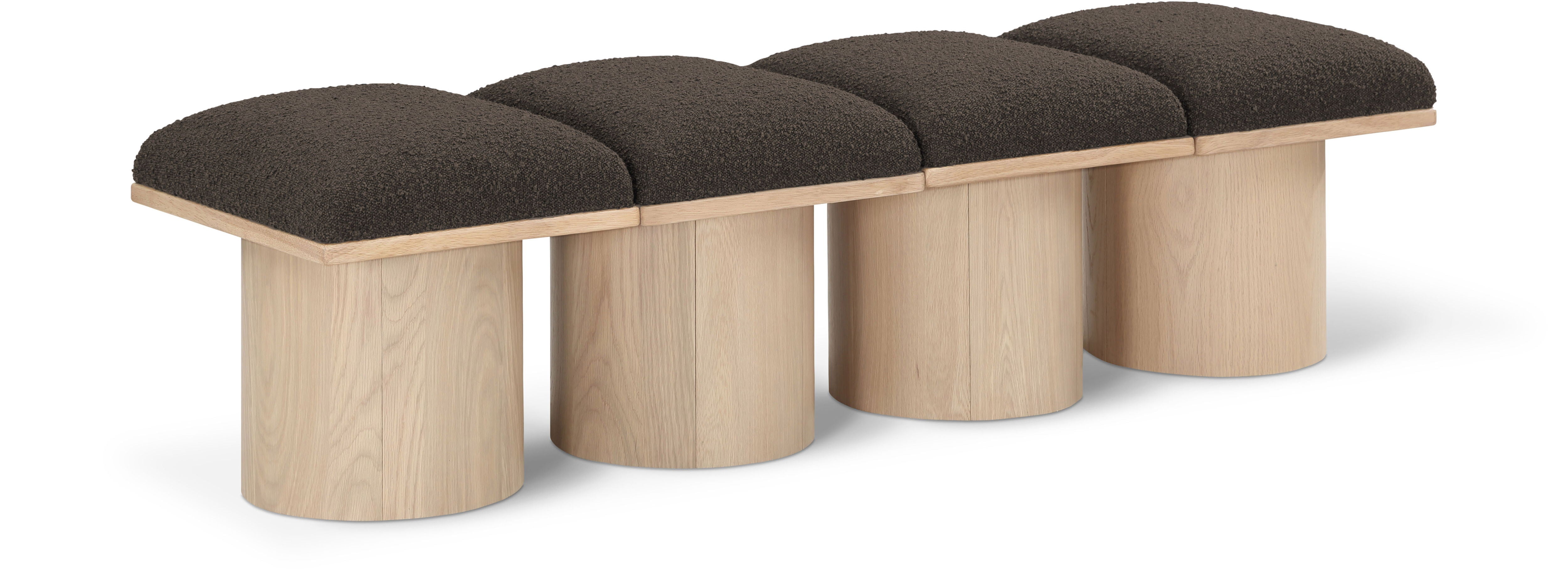 Bring valuable seating and remarkable style to your space with this Pavilion boucle fabric bench, an exquisite balance of style and usability for the entryway, bedroom, and beyond. Crafted from oak veneer with a natural finish, this bench has a 4-inch-thick seat cushion that's channel-tufted for a touch of luxury. The bench's columnar bases add a dash of art deco design, making it a captivating focal point in any room.