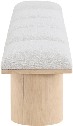 Bring valuable seating and remarkable style to your space with this Pavilion boucle fabric bench, an exquisite balance of style and usability for the entryway, bedroom, and beyond. Crafted from oak veneer with a natural finish, this bench has a 4-inch-thick seat cushion that's channel-tufted for a touch of luxury. The bench's columnar bases add a dash of art deco design, making it a captivating focal point in any room.