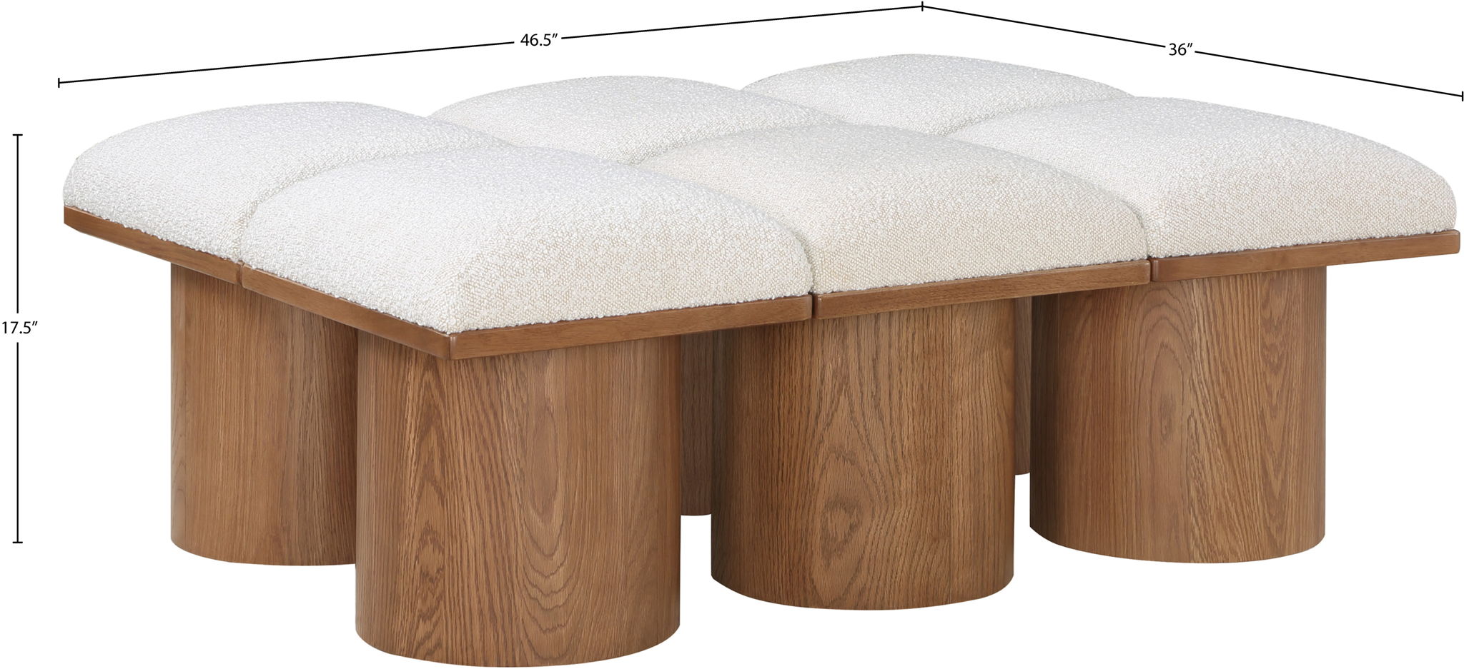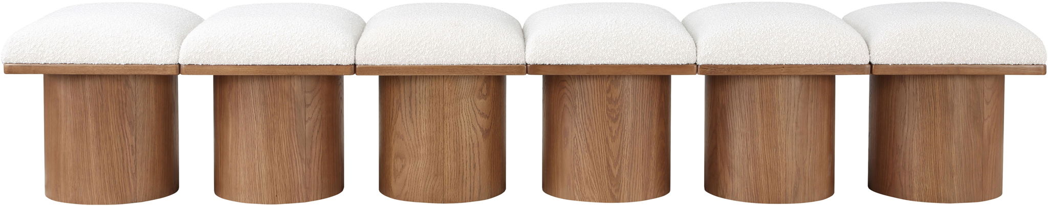 Bring valuable seating and remarkable style to your space with this Pavilion boucle fabric bench, an exquisite balance of style and usability for the entryway, bedroom, and beyond. Crafted from oak veneer with a walnut brown finish, this bench has a 4-inch-thick seat cushion that's channel-tufted for a touch of luxury. The bench's columnar bases add a dash of art deco design, making it a captivating focal point in any room.