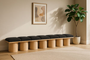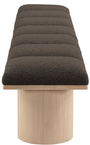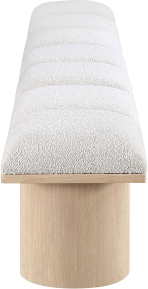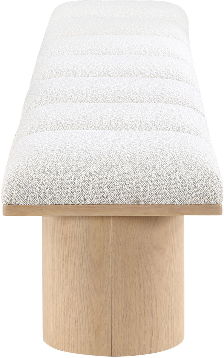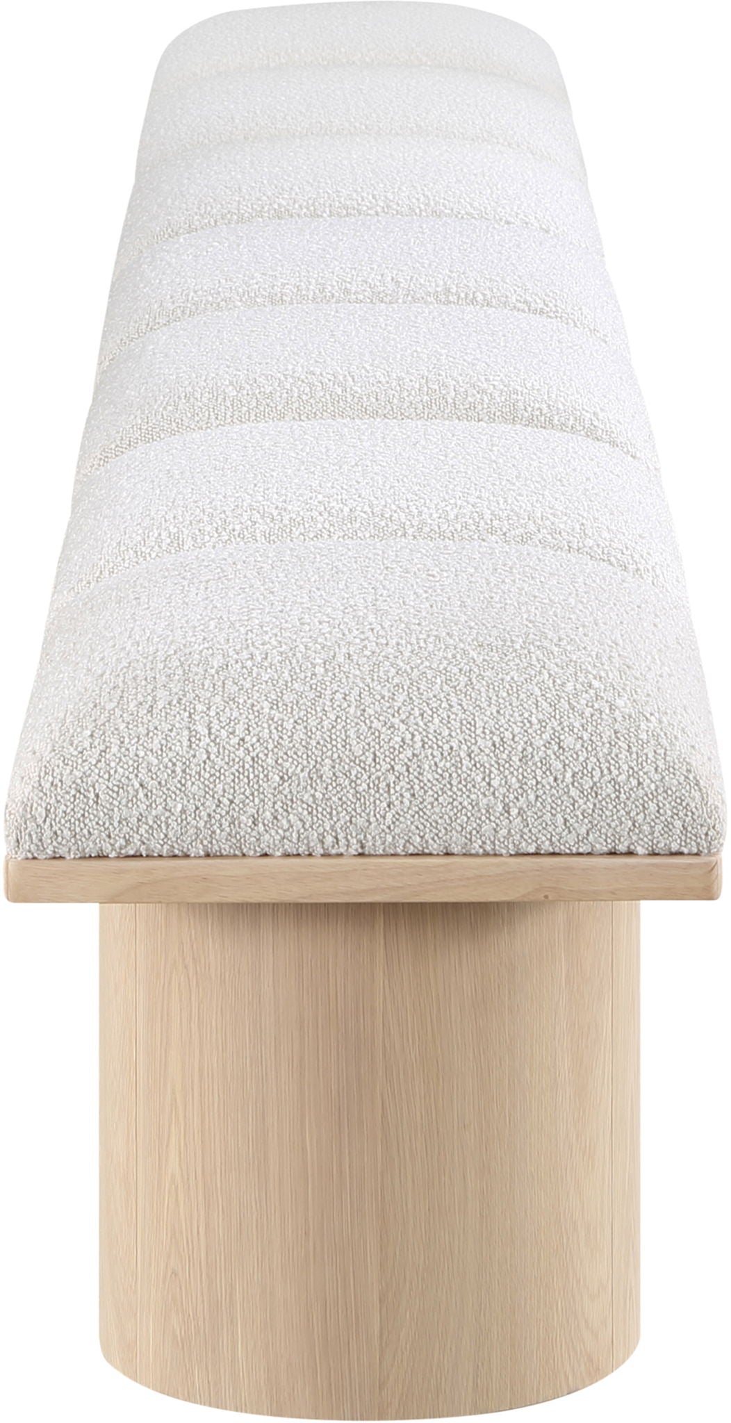 Bring valuable seating and remarkable style to your space with this Pavilion boucle fabric bench, an exquisite balance of style and usability for the entryway, bedroom, and beyond. Crafted from oak veneer with a natural finish, this bench has a 4-inch-thick seat cushion that's channel-tufted for a touch of luxury. The bench's columnar bases add a dash of art deco design, making it a captivating focal point in any room.