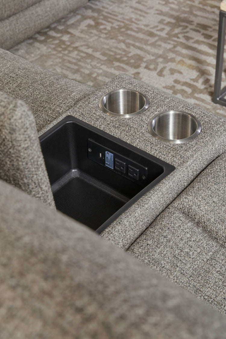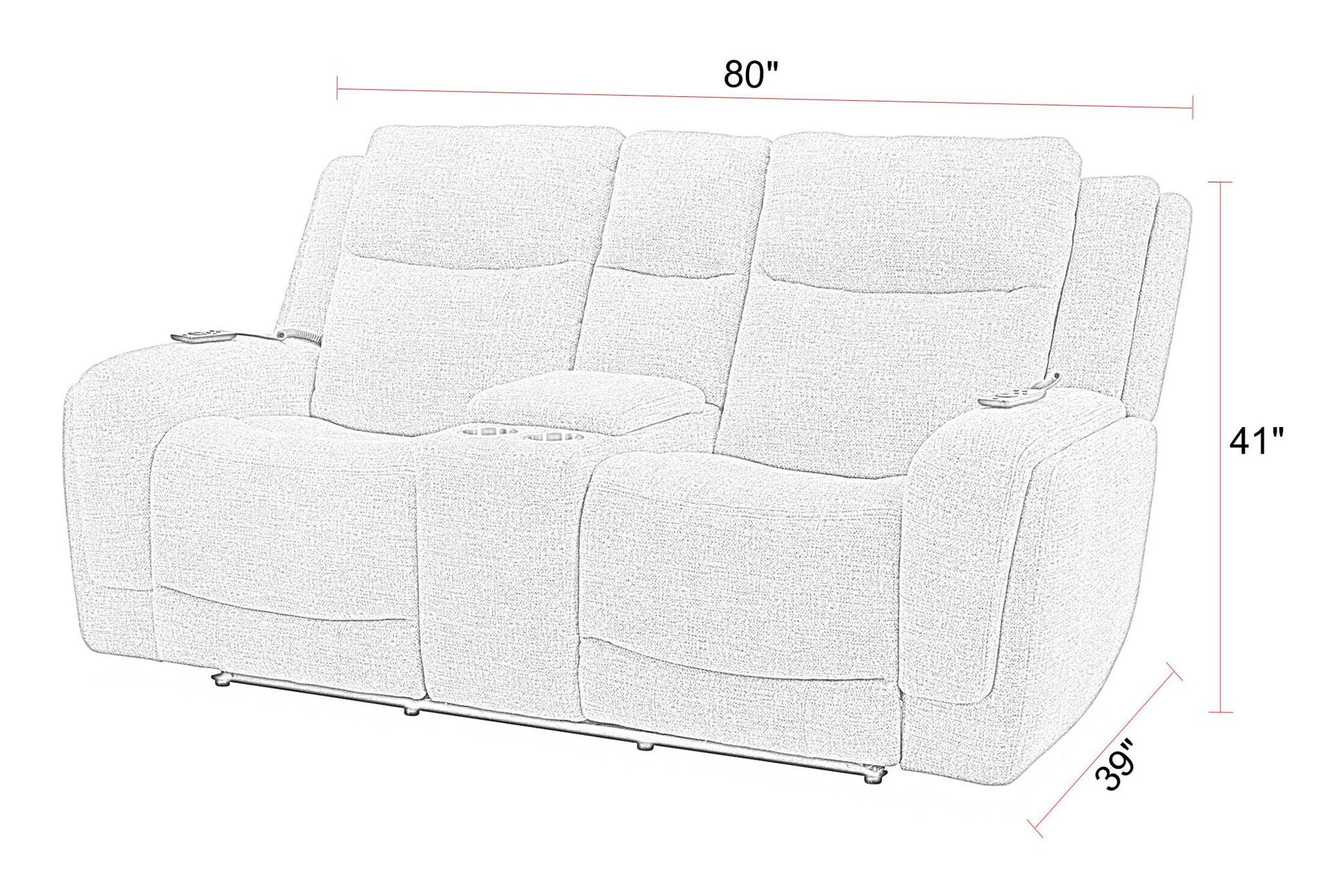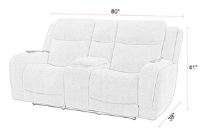 - Loveseat with console, stainless steel cup holders, and power station