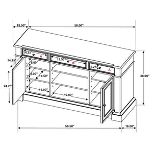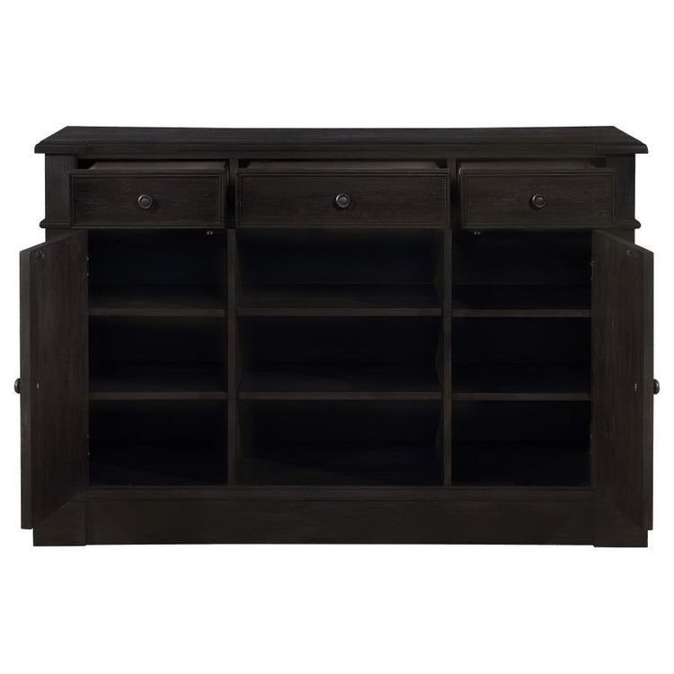Refined elegance meets everyday versatility in this beautifully crafted sideboard, designed to elevate any dining space. With its antique noir finish, this piece exudes a sense of timeless sophistication, effortlessly complementing both formal and casual settings. Built from poplar, engineered wood, and acacia veneer, it offers a perfect blend of durability and charm. Three drawers and two cabinet doors provide ample hidden storage, while six adjustable shelves allow for customizable organization. The open center cubbies create an inviting space to showcase decorative serveware, making this sideboard as functional as it is stunning.