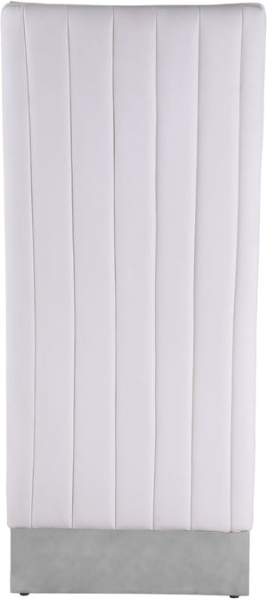 Bring the luxe look of this Porsha chair to your dining space. Impressing guests is simple when they're seated in this chair. The floor-length back is elegantly beautiful and creates a striking silhouette from every angle. Faux Leather upholstery material in a sophisticated hue of adds a touch of modernity to this chair, and the reverse is channel tufted for added elegance and refinement.