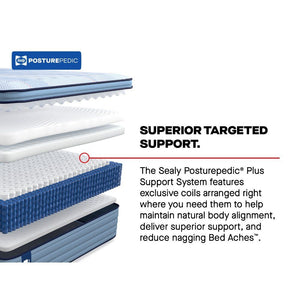 The Sealy Posturepedic Plus Spring Soft mattress delivers pressure-relieving comfort to help maintain natural body alignment and reduce nagging Bed Aches night after night. The orthopedic-inspired Posturepedic Plus Support System features exclusive PrecisionFit Coils, arranged right where you need them. Plus, the DuraFlex Coil Edge provides a reinforced solid surface that’s built to last.