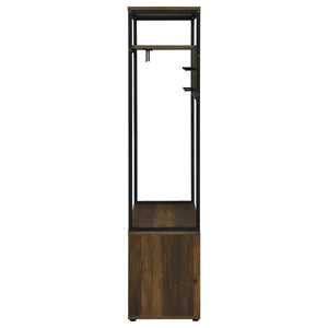 Your functional living space keeps clutter away with a rustic hall tree offering ample room for storage. Perfect for a transitional entryway or mud room, this hall tree features a lower cabinet and upper board made of rich dark pine finish wood products. Industrial inspiration adds black finish metal framing in a linear mode, adding an upper shelf for storage and a tray surface above its cabinet. Find four shelves behind two cabinet doors, ideal for concealing shoes and accessories. Hang coats, hats, and scarves on seven hooks, making them accessible with a quick reach.