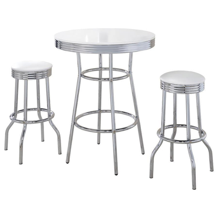 Step back in time with this exquisite 3-piece pub height bar table set, perfect for adding a touch of retro elegance to any space. The gleaming chrome base and laminate tabletop evoke the charm of a 1950s soda fountain, making every meal feel special. The set includes two matching backless swivel bar stools, upholstered in leatherette, bringing comfort and style to your gatherings. Whether you're enjoying a casual breakfast or an evening drink, this set transforms your space into a nostalgic yet sophisticated retreat. Embrace the perfect blend of past and present with this timeless ensemble.
