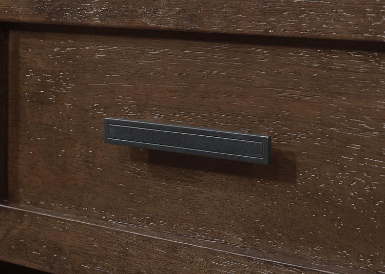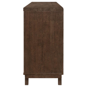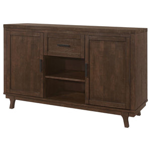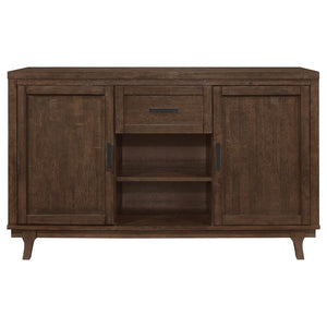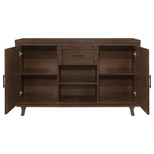 Enhance your dining area with our farmhouse and craftsman design dining server. Crafted from solid Asian hardwood, this server features a durable wire brushed brown oak finish, adding a rustic touch to your décor. It offers functionality with its two door cabinets, storage drawer, and two tiers of open shelving, providing ample space for organizing and displaying dining essentials.